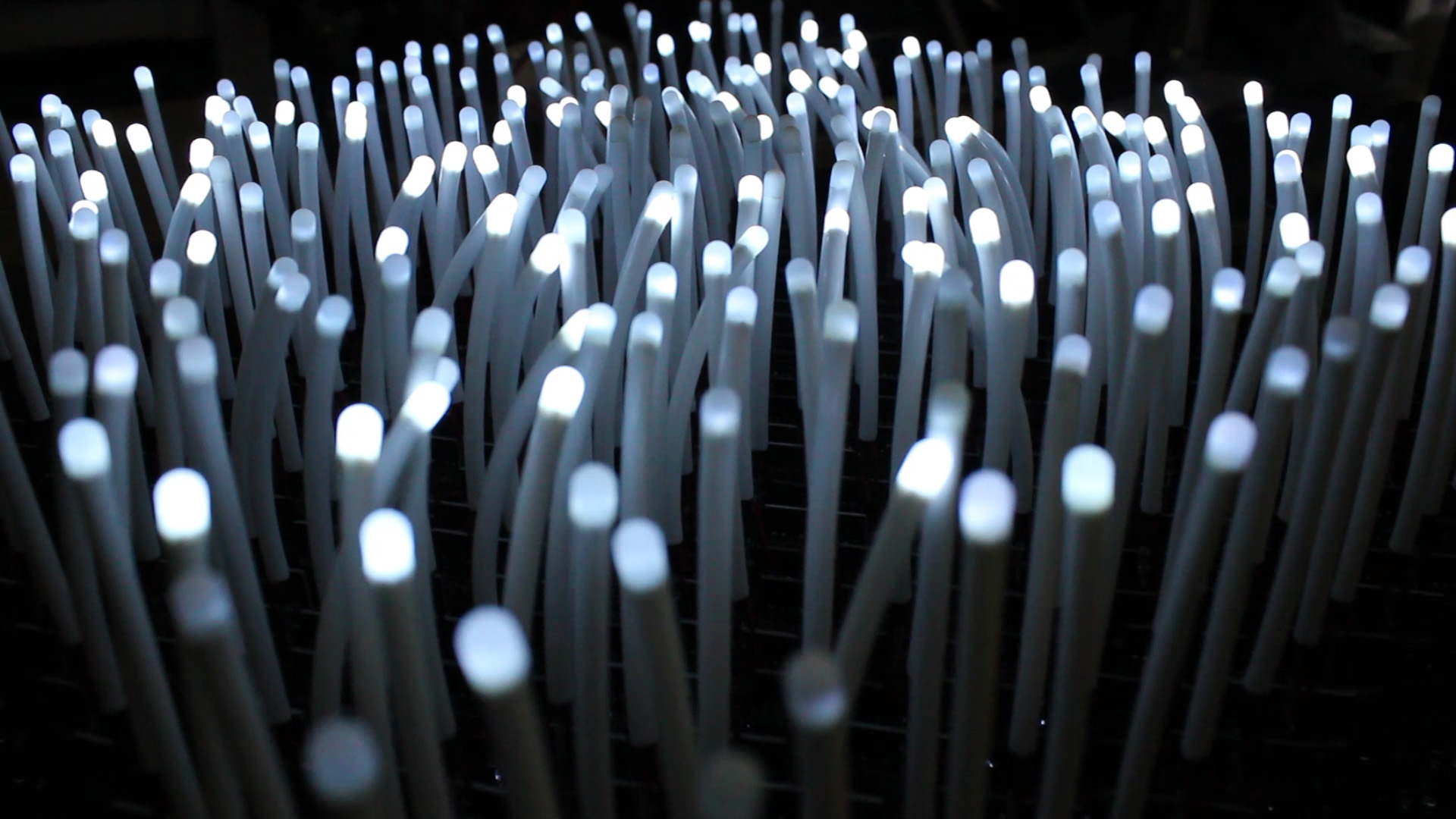 波間に揺れるイソギンチャクの触手を見る時、原始的な生物の存在を感じる。2014年のGenome Researchで発表された研究の中で、イソギンチャクは半分植物、半分動物であることが分かった。原始的であるからこそ多様性を内包したその生態に、人間が理解できない混沌の中に、生物らしさ、美しさを感じるものがあるのではないか。Luminescent Tentaclesは、このイソギンチャクの触手をモチーフにして制作したインタラクティブアート作品である。触手にあたる256個のアクチュエータはバイオメタル(形状記憶合金)によって駆動し、かざした手の動きに合わせて、先端の光とともに柔らかく曲がる。それぞれのアクチュエータは3本のバイオメタルによって駆動し、印加する電流の組み合わせによって6方向に曲がることができる。アクチュエータ毎に1個のマイコンを実装して分散処理することで、多数のアクチュエータを滑らかに制御することを可能にした。画像解析には Kinectセンサーを利用し、制御プログラムでは流体シミュレーションをベースとして、波紋のように触手の動きが伝搬する表現を実現した。手の動きをトリガーとし、ソフトウェアシンセサイザーから発生する音によって音楽が奏でられる。その様子は、海に漂うイソギンチャクの触手のようでもあれば、風になびく葦をも想像させる。暗い空間に浮かび上がる光のまたたきと微かな動きは、どこかで見た風景、夢で見たような風景を思い起こさせる。