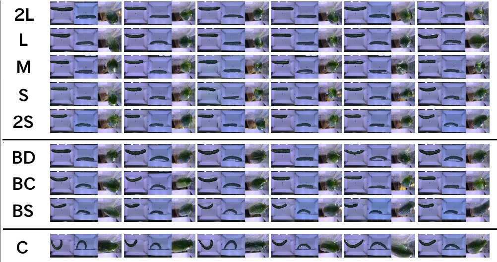 きゅうりを市場に出荷する際、太さ、長さ、曲がり具合、色艶、傷の有無などで、9種類の等級に仕分けする必要があります。