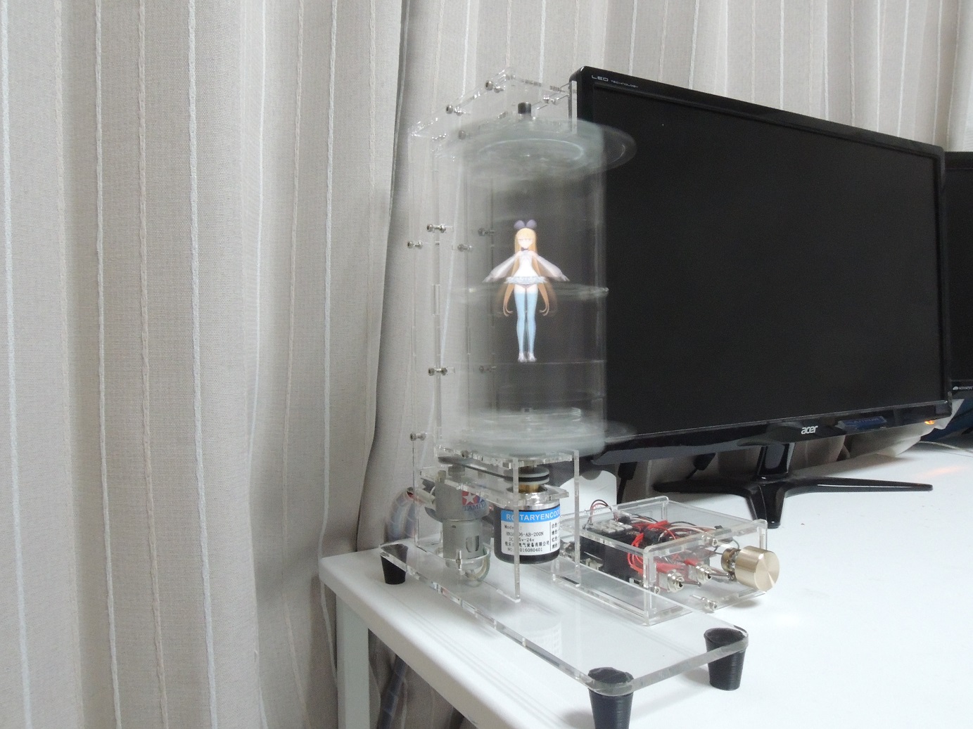 現在、VRやAR等を利用した機器など様々なものが実用化され、販売されています。また、3Dのテレビや映画など、今まで2次元でしか楽しめなかったものが、立体感をもって感じられるようになってきました。しかしながら、それらの多くは眼鏡をかける必要があり、「誰でも」、「いつでも」楽しめるものとは言えないと考えています。また、3Dテレビのようなディスプレイで立体感を出すものは、正面からしか立体に感じることができないという問題もあります。そこで、スマートフォンに画像を表示させ、それを回転させることで立体の表示を行うデバイスを作成しました。360°回転することで、前からも後ろからも立体的に物体をとらえることができます。透明なアクリル素材を用いているため、真後ろからでも見ることができます。また材料費も12000円程度と安価に作成することができます。
