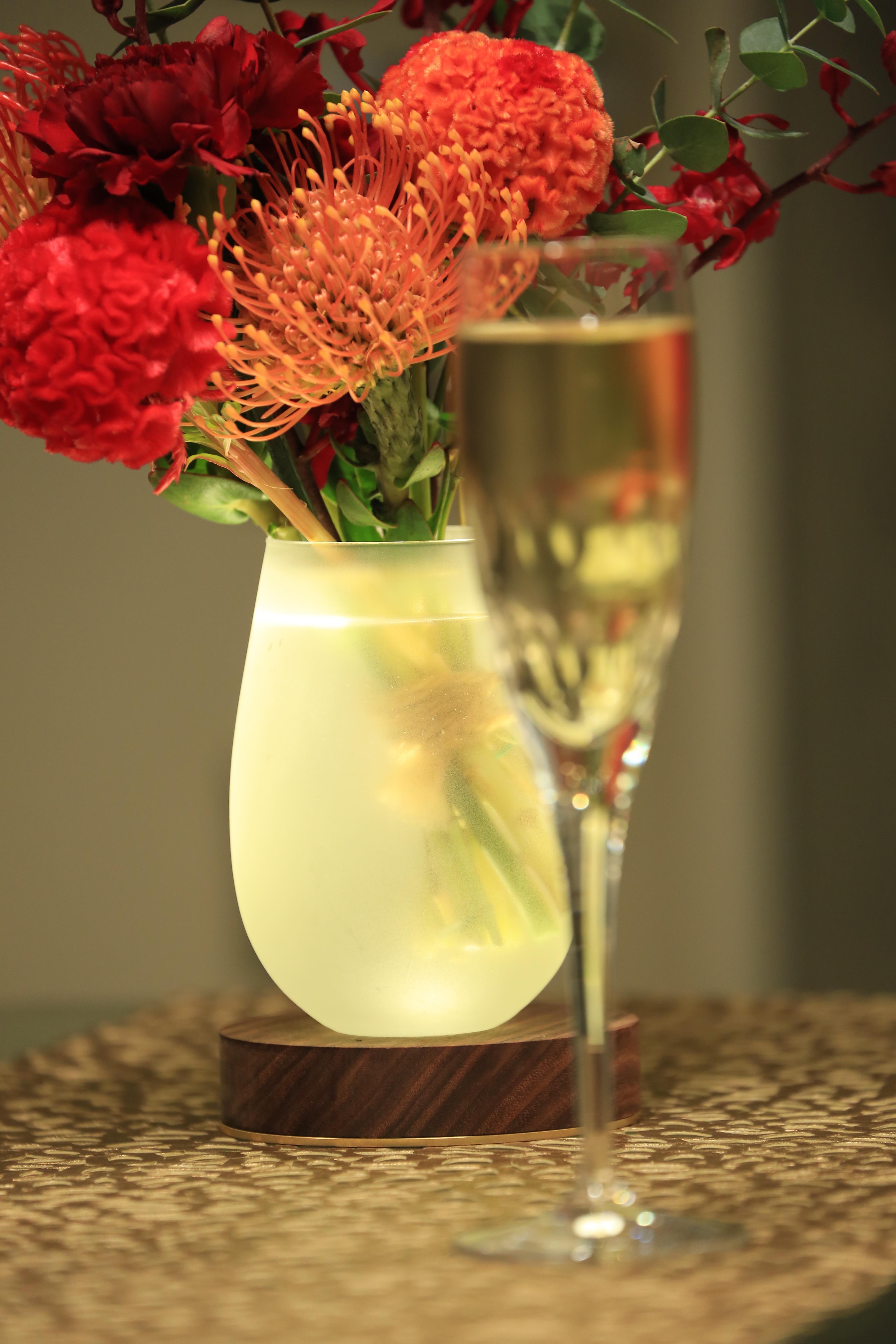 本体の外装は継ぎ目のない削りだしのウッド素材を使用し、花器は柔らかに光を届ける磨り硝子のものを選びました。?また、