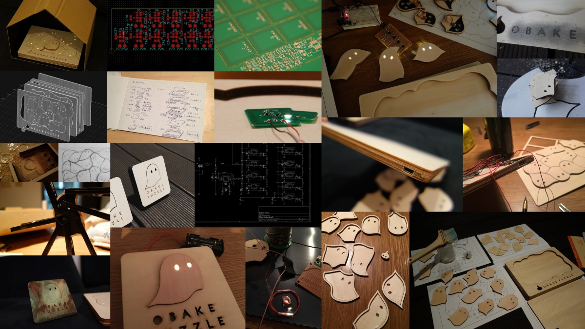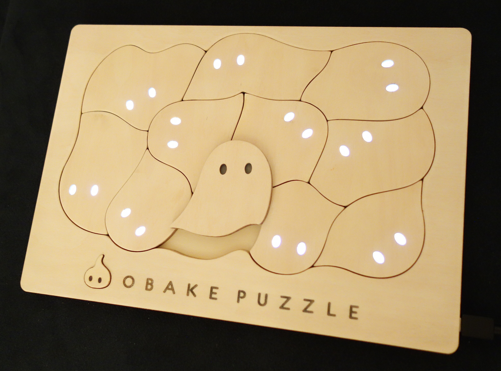 一見普通の木製のパズルですが、ピースをはめていくとオバケの目が光り出す、インタラクティブなパズルです。