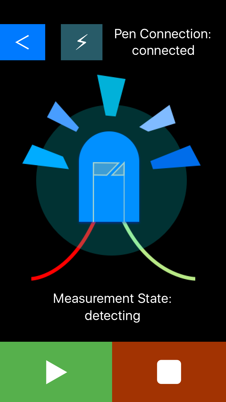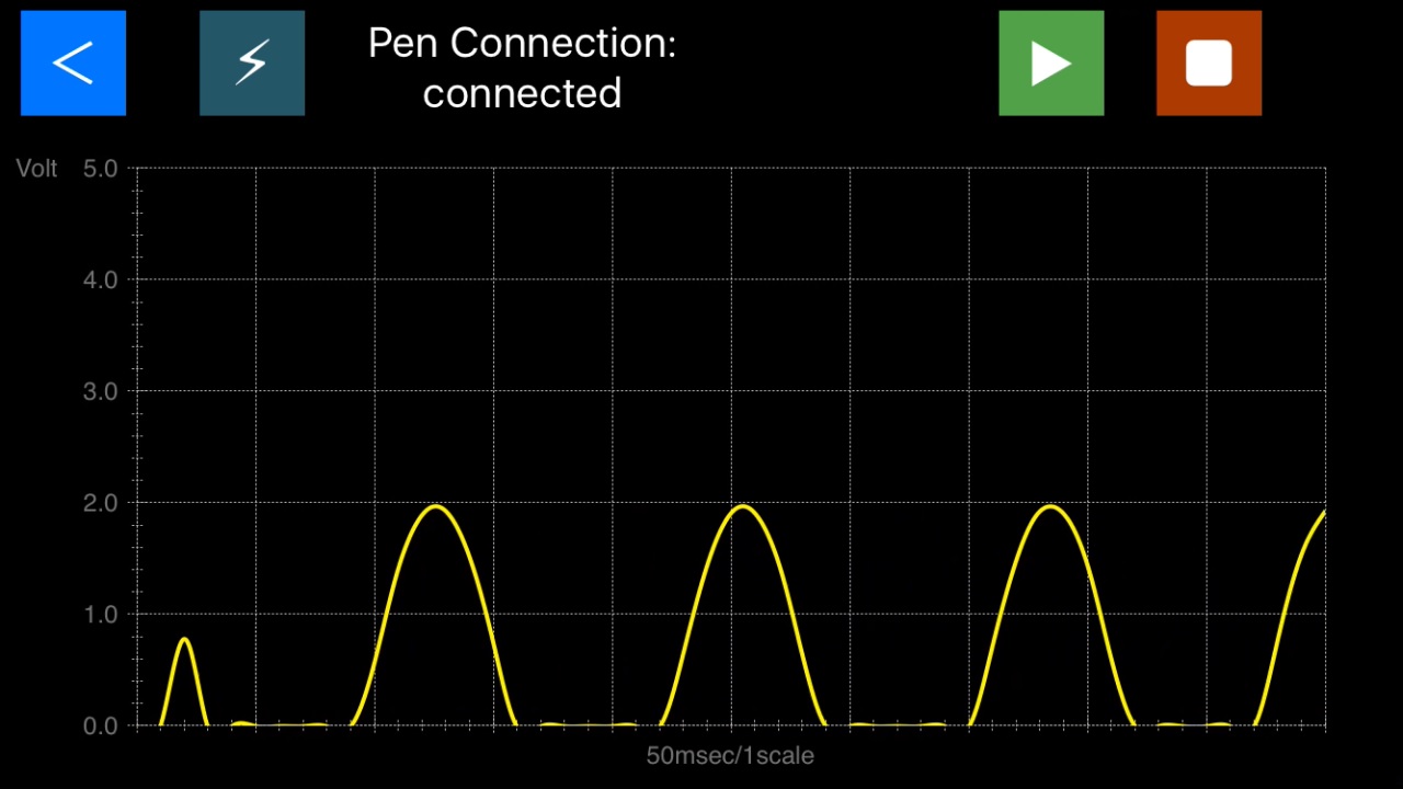 この装置は,測定した電気信号の電圧値を,Bluetoothでスマートフォンへリアルタイムに送信しており,専用アプリが受信した測定値を波形として表示してくれます.