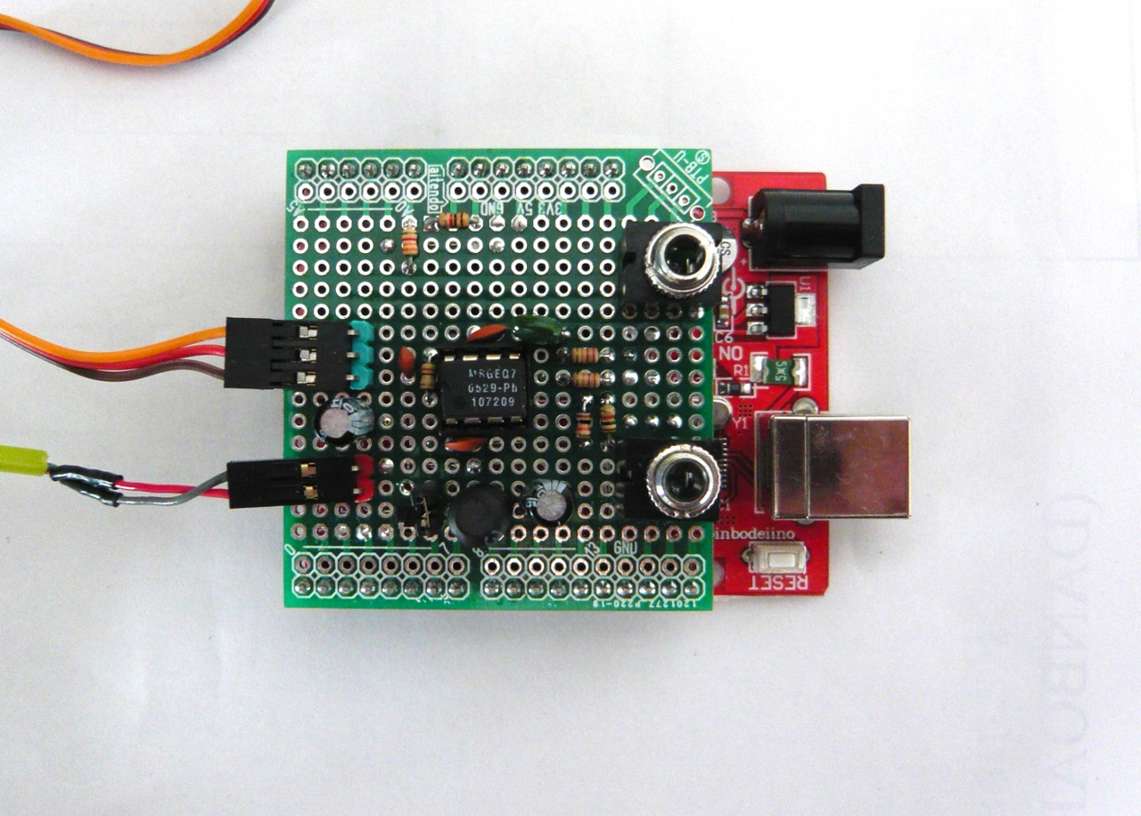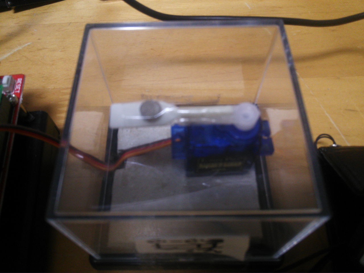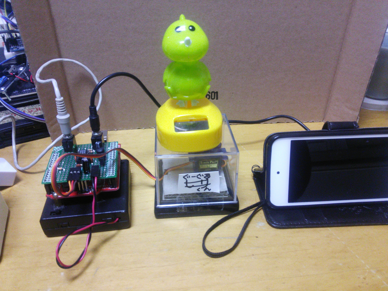 iPod Touchのヘッドホン出力をバンドパスフィルタ経由で声の帯域を検出しArduinoのA/Dへ入力、レベルに応じてサーボにつけた磁石で動かしています。