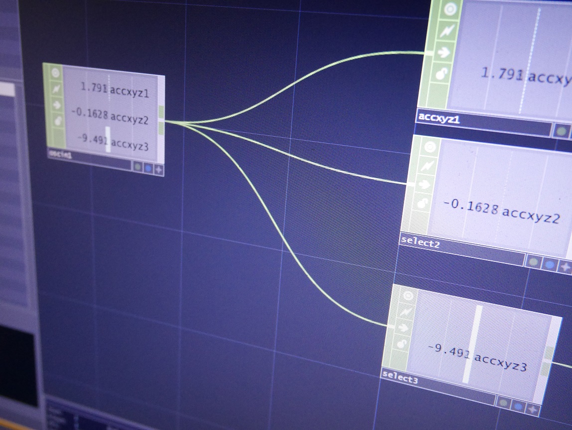 インタラクション部分は、映像をご覧になって頂ければと思いますが、スマートホンに動きを加えると、その内蔵されている加速度センサーの値が変化します。この加速度の数値は、OSC通信によって開発PCに取得されます。開発PCでは、加速度に応じ映像エフェクト処理や、LEDを点灯させるための処理を行っています。それぞれの処理データをDMX機器やプロジェクターに配線することで、インタラクティブ空間を創り出しています。
