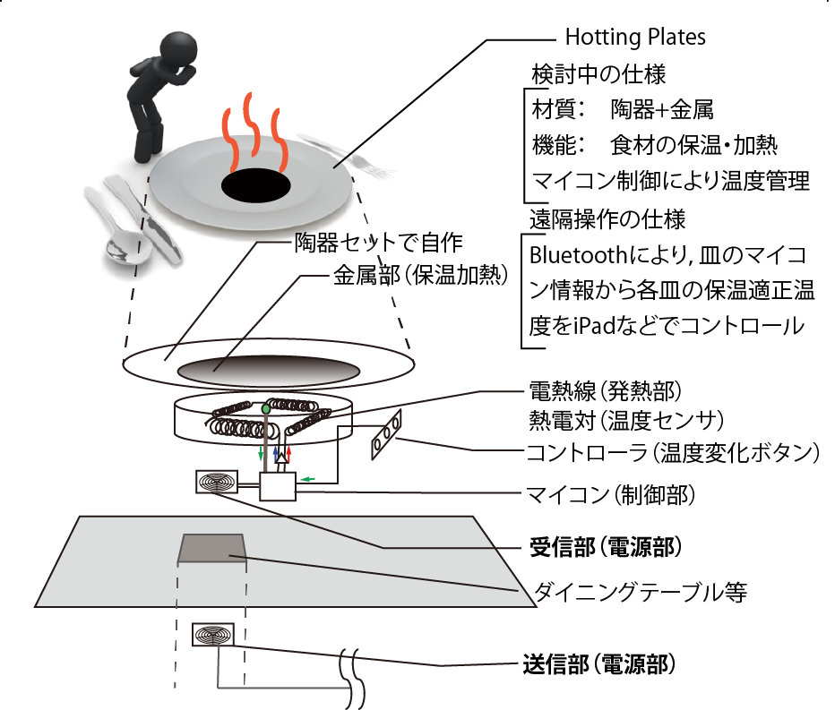 よそって,食べる人がちょっと遅れて冷めてしまう.2,30年前に電子レンジが登場し,「お皿ごとレンジでチン」あったまるけど,せっかくの絶妙な触感や火加減がなくなってしまう.そろそろよそったお皿が頑張るべきではないでしょうか?私達は,日頃使うもっと身近なものを発展できないかと考え,この「ワイヤレス・コネクテッドおさら Hotting Plates」を考えました.これは,ダイニングテーブルに設置されたワイヤレス給電装置によって,お皿に埋め込まれた受電機にマイコンと電熱線を入れ込んだお皿に給電し,料理を保温することで,おいしい状態を保ちます.また携帯アプリによってお皿の温度情報を取得・加熱・保温が可能です.さらに過熱の際にワイヤレス給電電力が足りない際にはお皿に搭載された充電池からこれを補うシステムを作成しました.