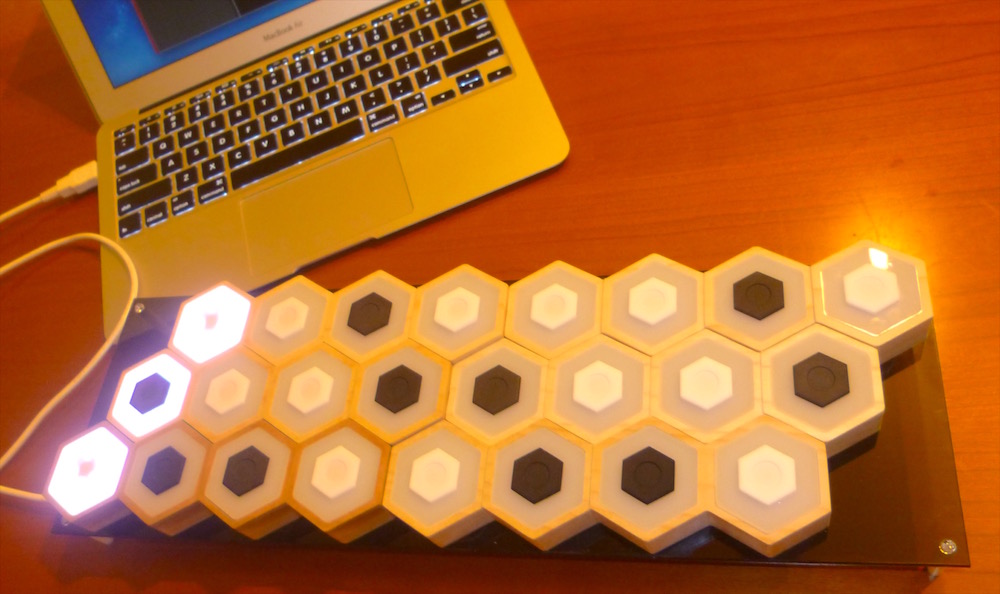 HoneycombBell(ハニカムベル)は六角形の連なり(ハニカム型)の光るタッチ式楽器です。各六角形の中心部をタッチすることによって、その六角形に割り当てられた音程の音が発音します。