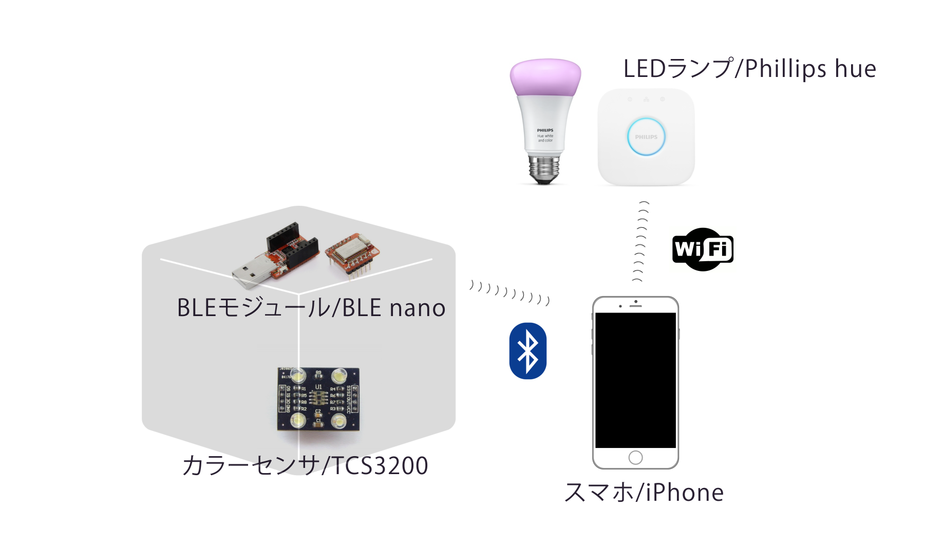 カラーセンサで液体の色を読み取り、その情報をBluetoothでスマホに送信します。スマホは受け取った情報を、あらゆる色に発光可能なPhillips hueに送信し、カラーセンサで読んだ色に応じて光ります。