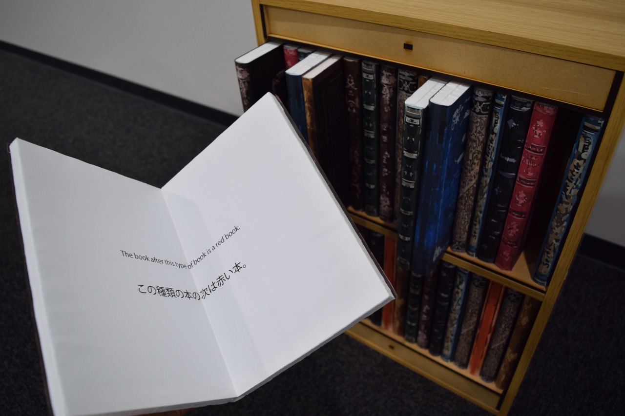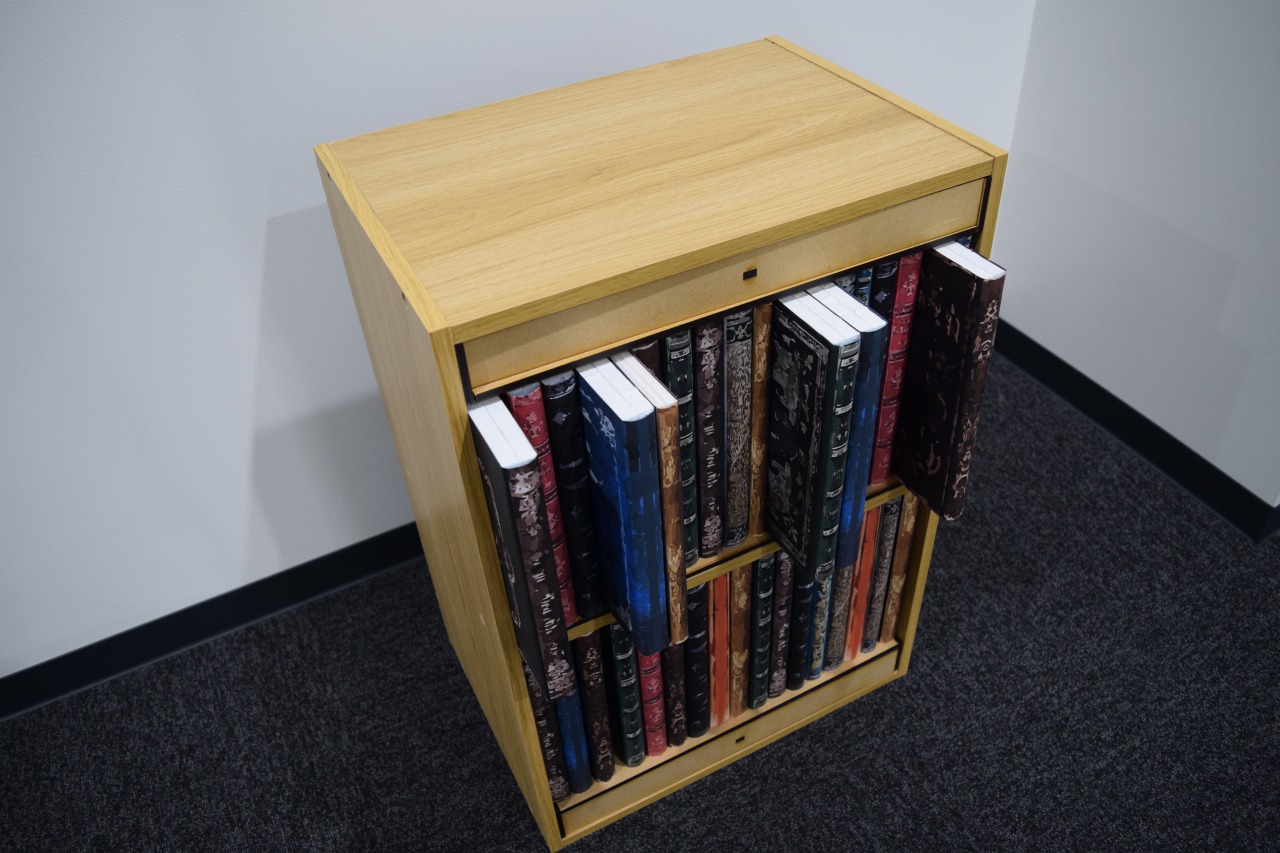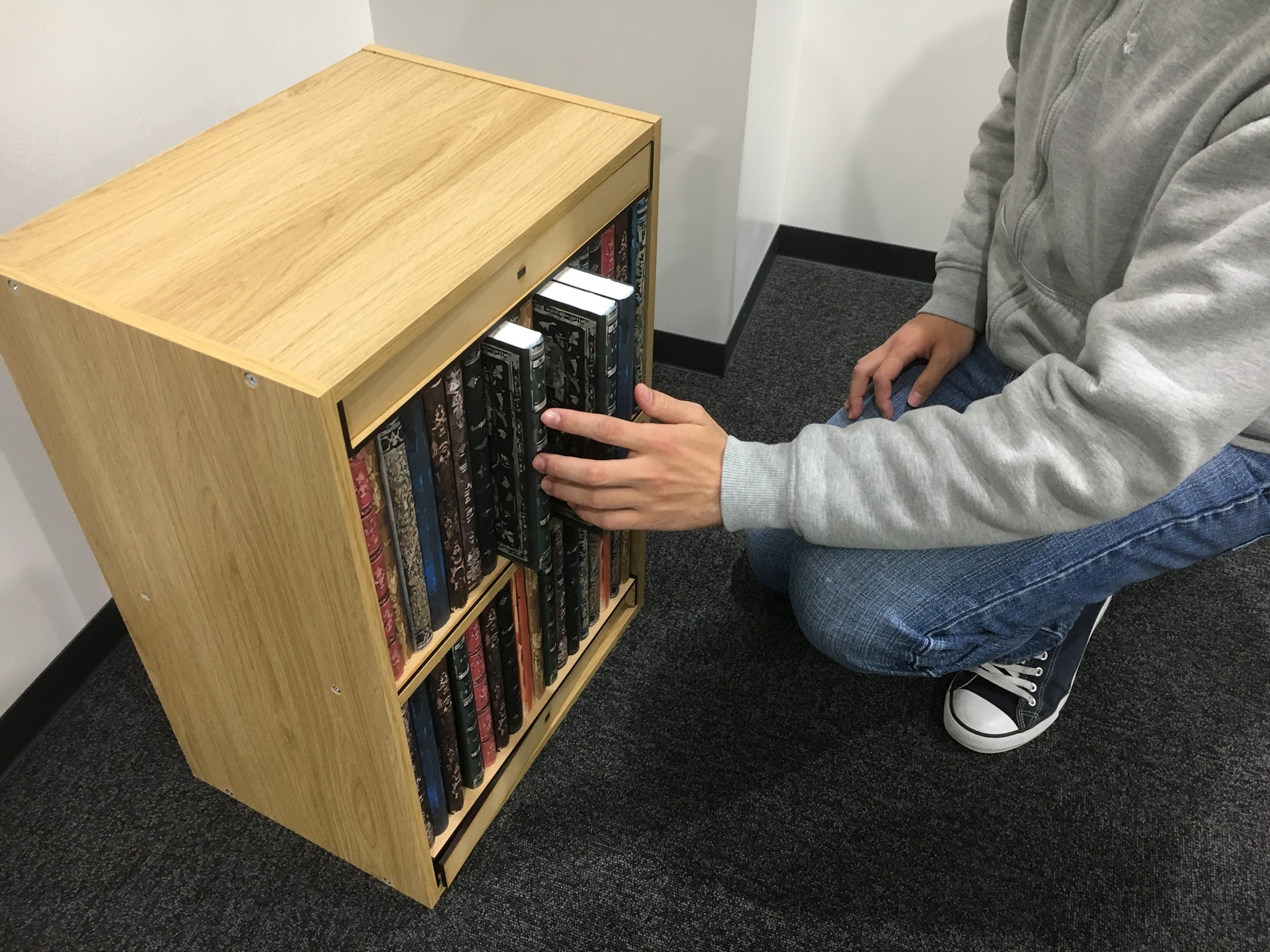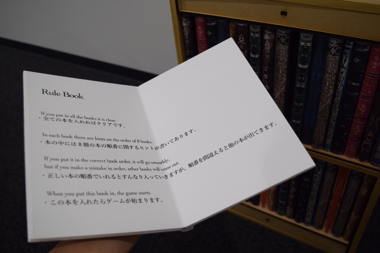 魔法の世界に登場するような、本がひとりでに飛び出してくる本棚です。この本棚はパズルゲームになっており、上の段の本をすべてしまい終えると、ゲームクリアです。それぞれの本には本をしまう順番のヒントが書かれており、ゲームをクリアすると、下の段の本が評価を教えてくれます。