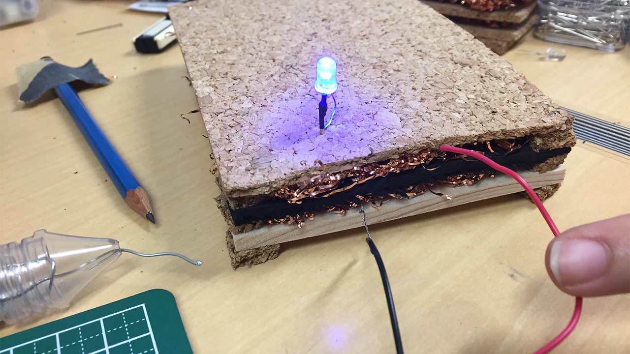 コルクボードは実は1層ではありません。コルクの層に加え、金属でできた導電層がふたつあり、それぞれプラスとマイナスに導電しています。