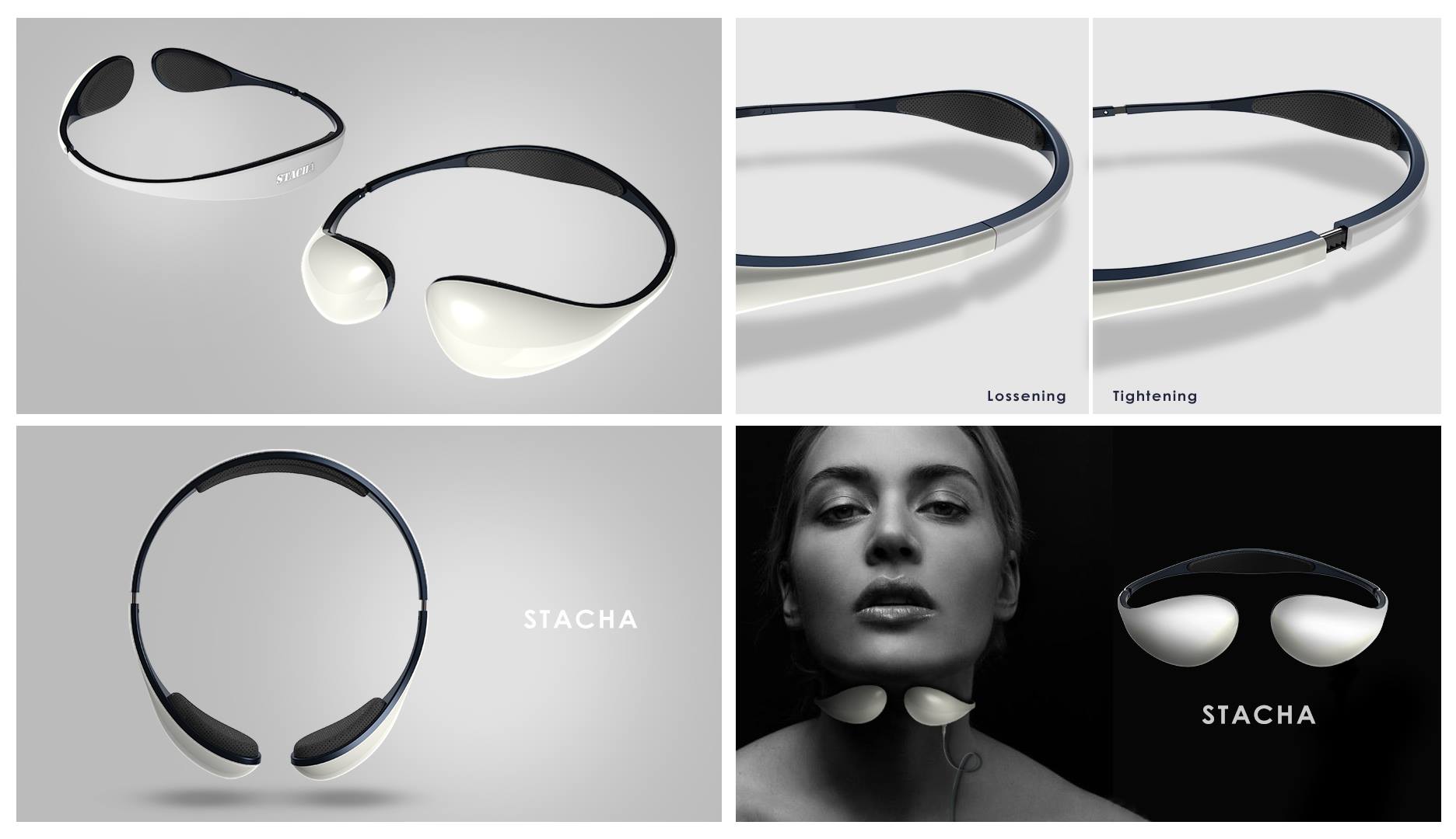 STACHAは吃音障害体験デバイスです。吃音者がどもる時、喉の筋肉が過剰に働くという特徴があります。首輪型デバイスを装着し、喉の部分に微弱な電流を流し筋肉を収縮させることで発音が困難な状況を再現し、リアルな吃音の体験が出来るように開発しています。難発性の場合人数が増えるほど吃りやすくなる傾向があるため、音声認識で音を拾ってレベル感知し、音のレベルに合わせて喉に与える刺激を強くする等の仕組みも検討しており、教育に導入することを想定しています。