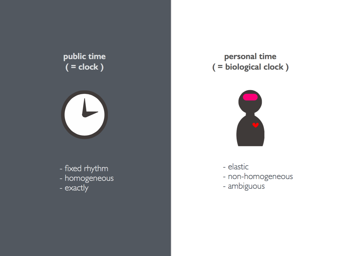 私たちは現代社会において、明治時代以降西欧よりもたらされた機械時計を、何の疑いもなく使っている。個々の人間に関わらず、私たちは同じ時間感覚を公共の時間として一様に受け入れている。しかしそれは、私たちの生活を厳密にし、均質化して加速させているのではないか。現代社会のストレスの原因の一つになっているのではないだろうか。