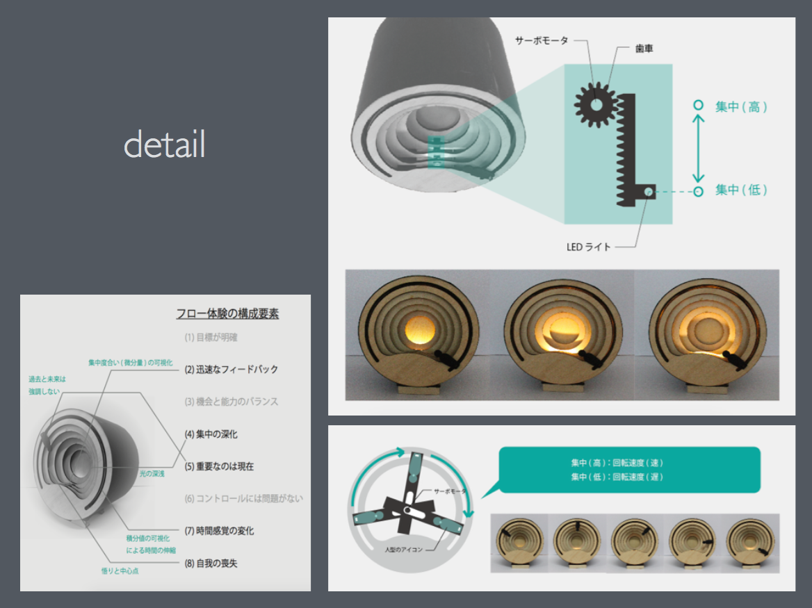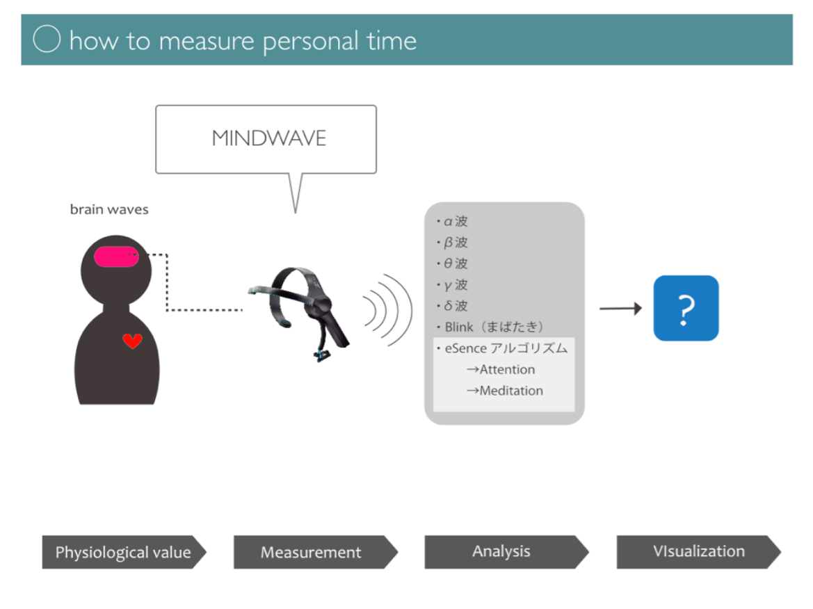 今回、mindwaveという脳波センサーを用いて、「個人の時間」を可視化する新しい時計の開発を行った。具体的には、集中度合いを計測し、集中度が高ければ針が早く進み、低ければ針が遅く進む。