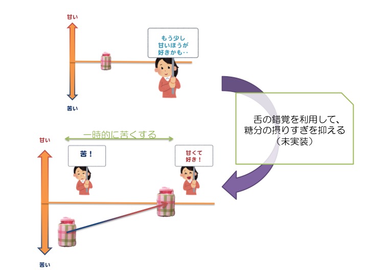 ・一時的に苦い割合にし、普通の甘さの割合を、強い甘さと錯覚させることで、摂りすぎを防止する