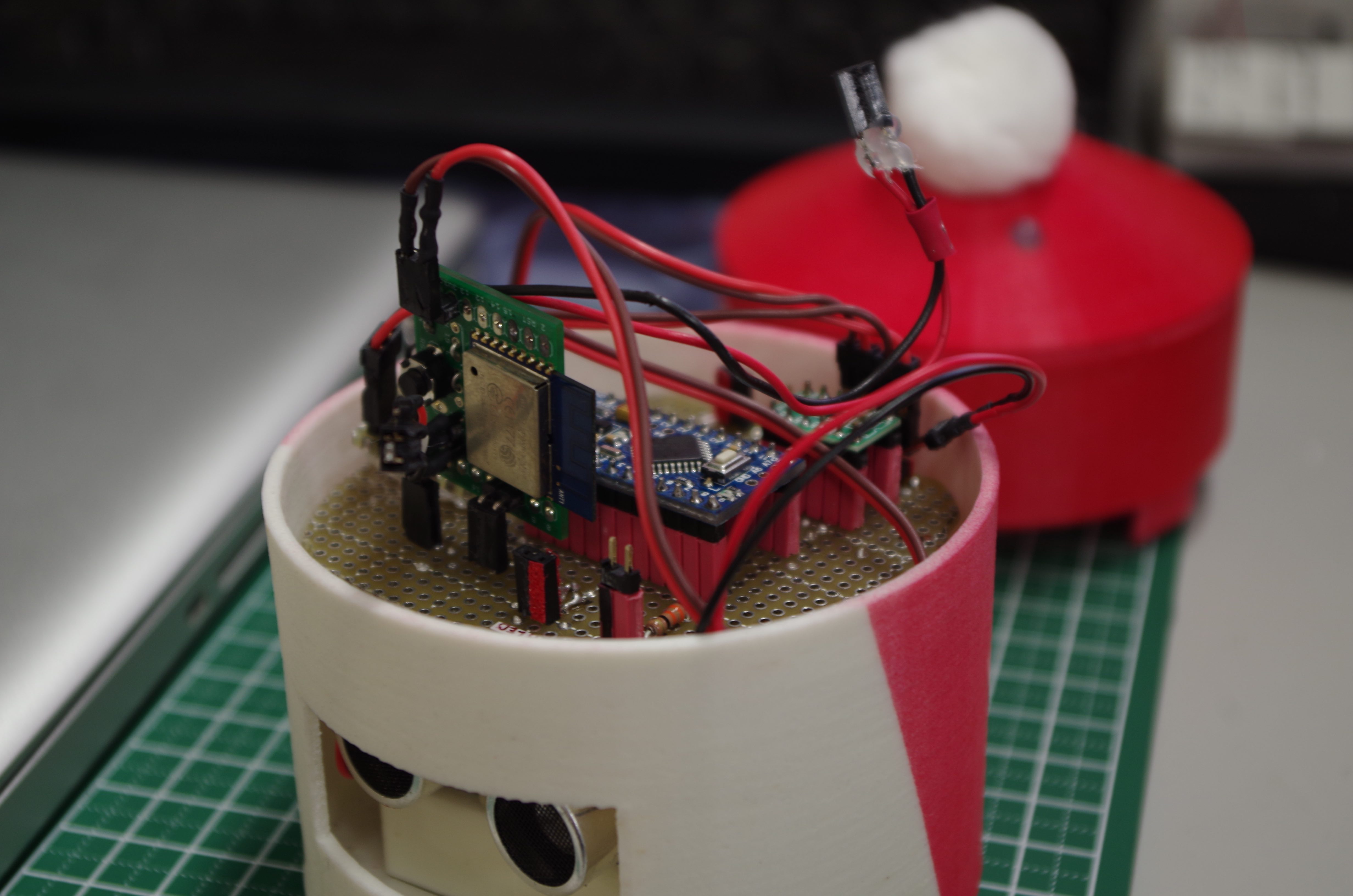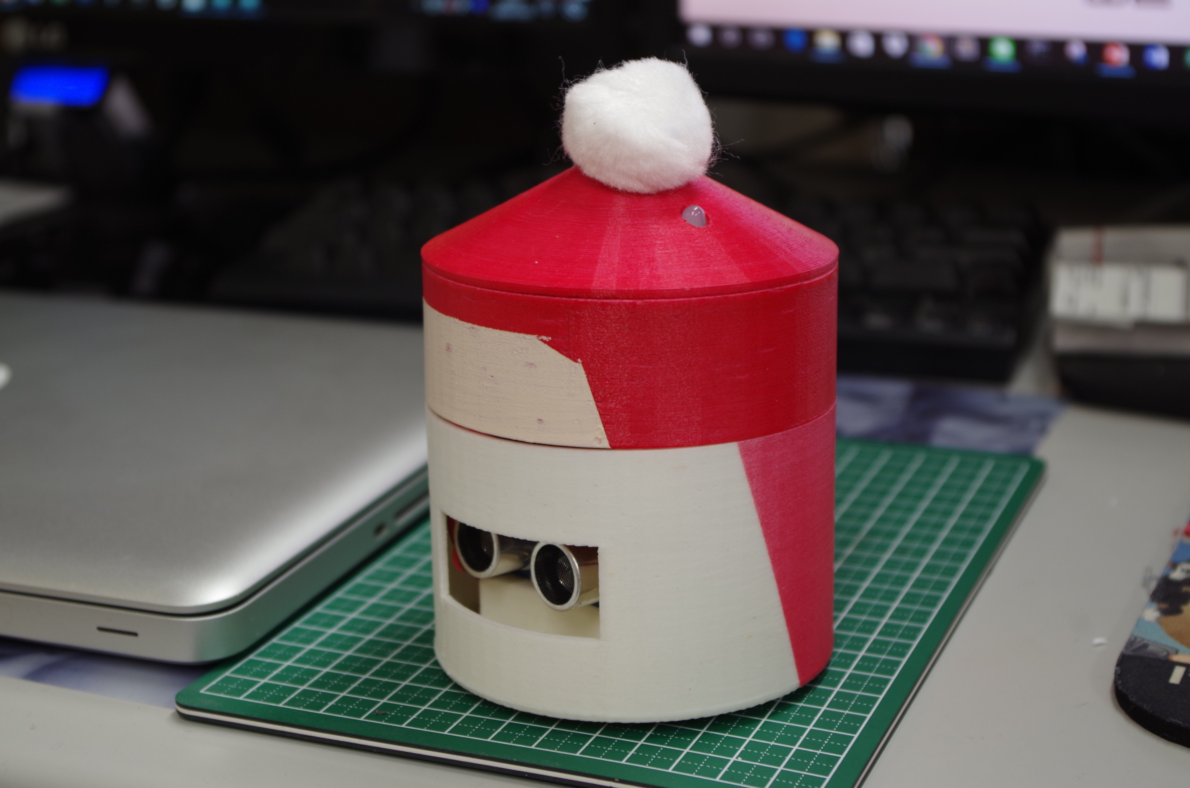本作品は3体のロボットを独立に蓄光シート上を動かし搭載されたブラックLEDによって動いた軌跡が描かれる作品です。3体のうち1体には無線通信機能が内蔵されており、タブレットやスマートフォンを用いて「自走モード」、「ラジオコントロールモード」を切り替えることができます。この「ラジオコントロールモード」を用いることによってロボットに描きたい光アートを描かせることができます。ロボットはクリスマスをモチーフにデザインされており、外にイルミネーションを見に行く代わりに、家の中で光アートを楽しむことができます。