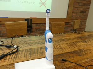 毎日行っている歯磨きを効率化するというスマート電動歯ブラシ。先端にカメラを搭載し、その映像をスマートフォンで確認しながら、歯を磨くことができる。紫外線を当てることで、歯垢を可視化。汚れているところを重点的に磨けるので、効率化が実現する。