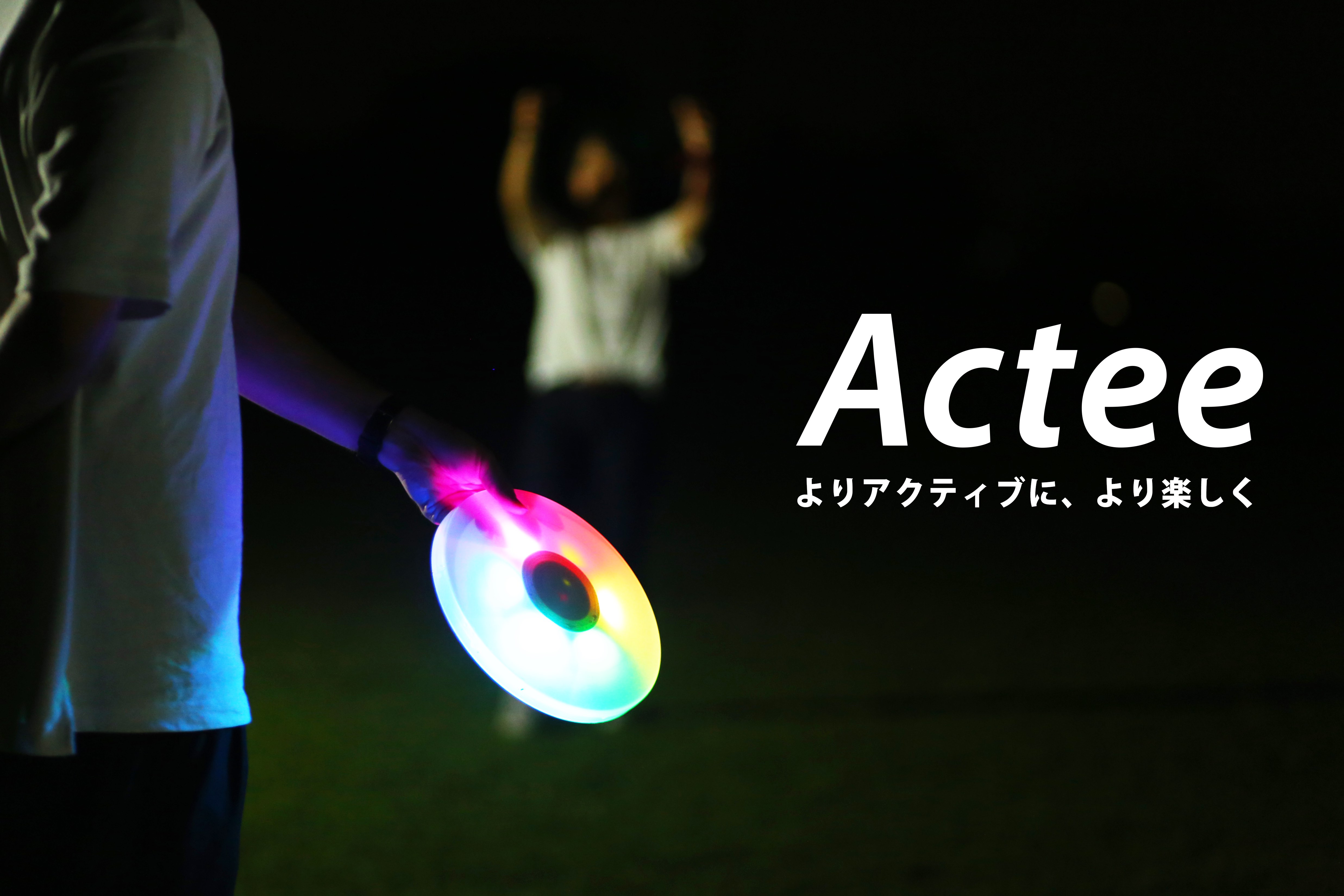 Acteeとは、「投げ方によって色が変わる」をコンセプトとした、光で変化するフライングディスクです。投げた瞬間に、内蔵されている加速度センサが回転速度と軸のブレ具合を検知し、飛んでいる間だけ光の色が変化する仕組みになっています。また、同じ色を三回連続で出すと、それぞれ違った光り方を見せてくれます。さらに、ずっと使っているとシークレットな反応を見せてくれることもあります。
