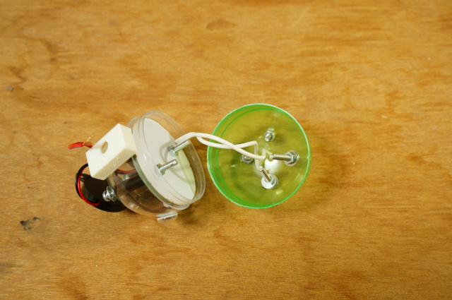 カプセル内にあるのはブザー回路ですが、回路の一部が切断されています。中に針金や金属片、抵抗器などの導電体を入れて振ると、切断された部分に偶然触れて音が鳴ります。要は接触の悪いブザー回路です。抵抗値により音の高さが変わるため、導電体の種類により違った趣の音が出ます。