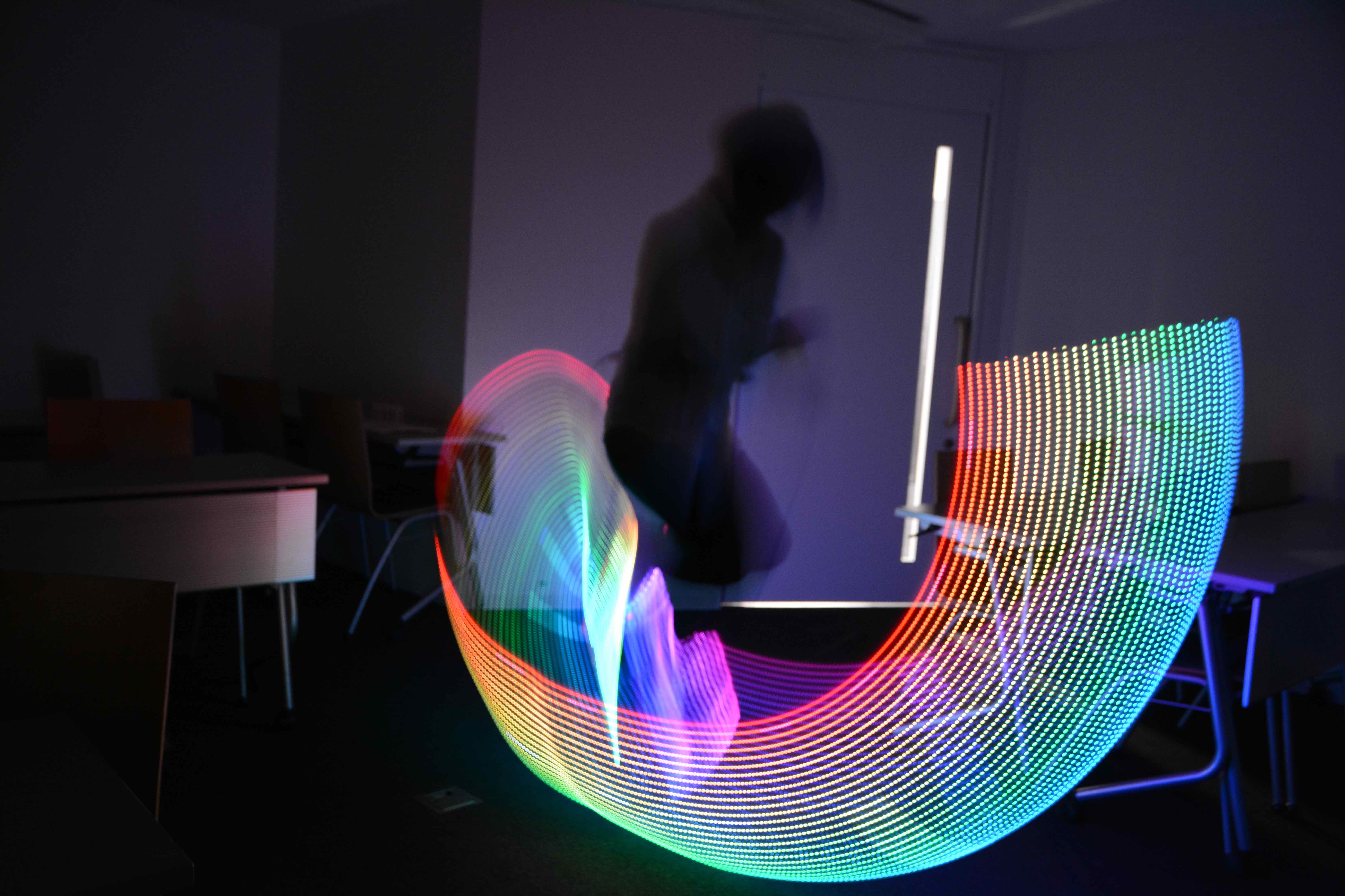 ロープに内蔵されたLEDの光が、跳ぶ速さや跳び方によってインタラクティブに変化します。