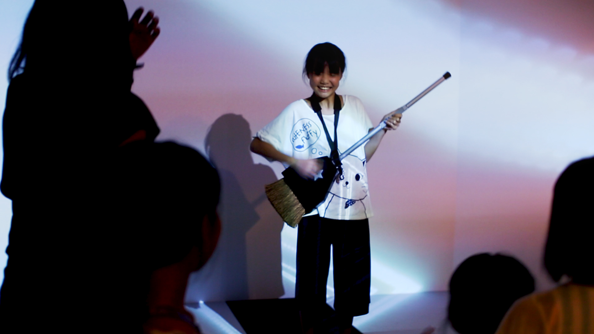 ロックスターに憧れ、掃除時間にしたホウキギター遊び。ホウキをかき鳴らすとエレキギターの音が響き、ステージの自分にスポットライトが当たるという妄想。その夢が現実になるホウキギターを制作した。