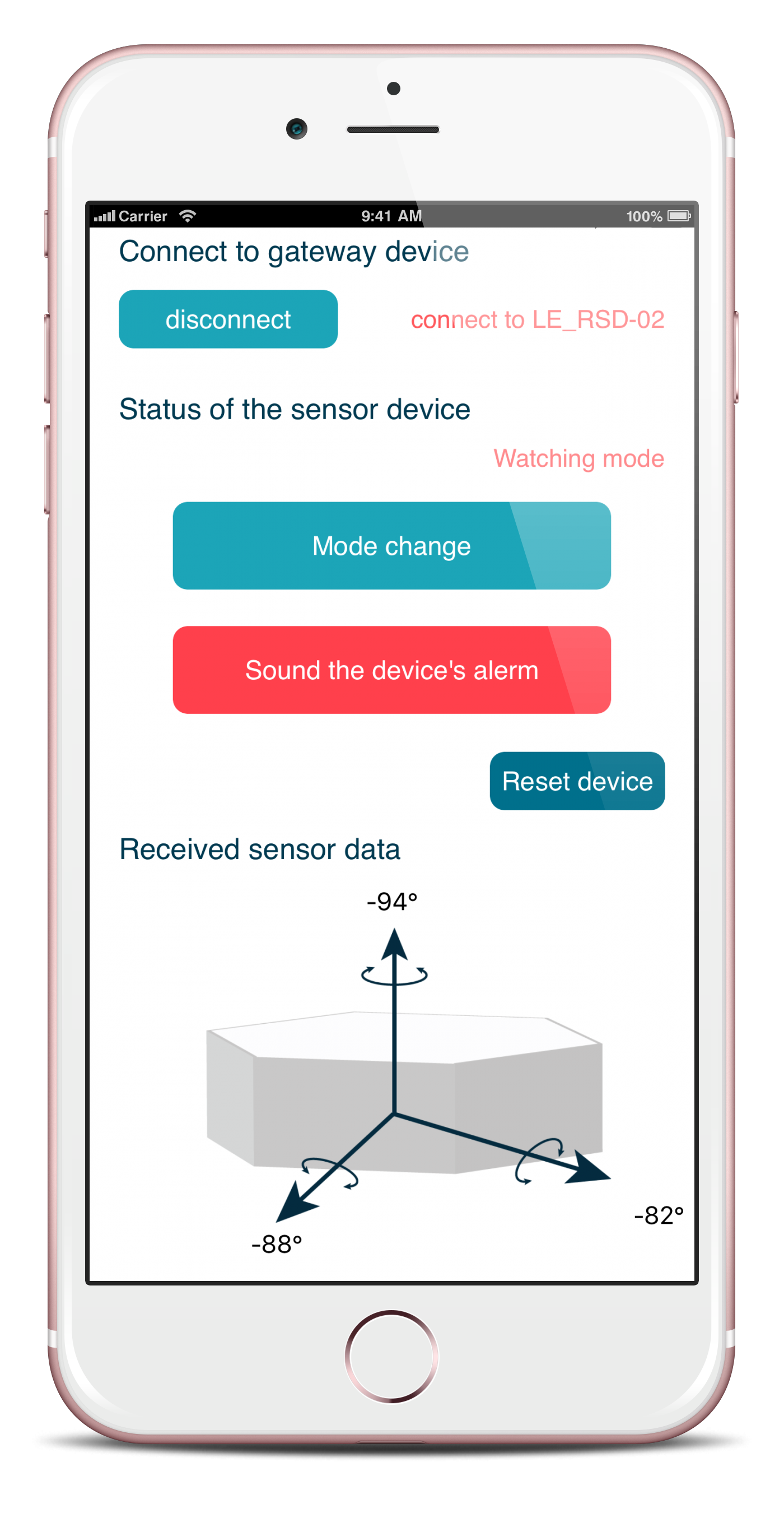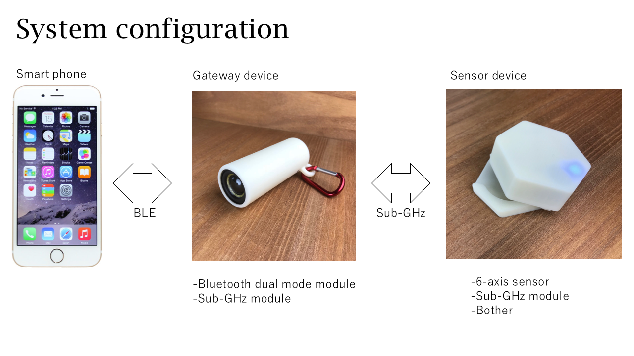 このプロダクトは専用アプリの入ったiPhone,Gateway device,Sensor deviceの3つからなります。