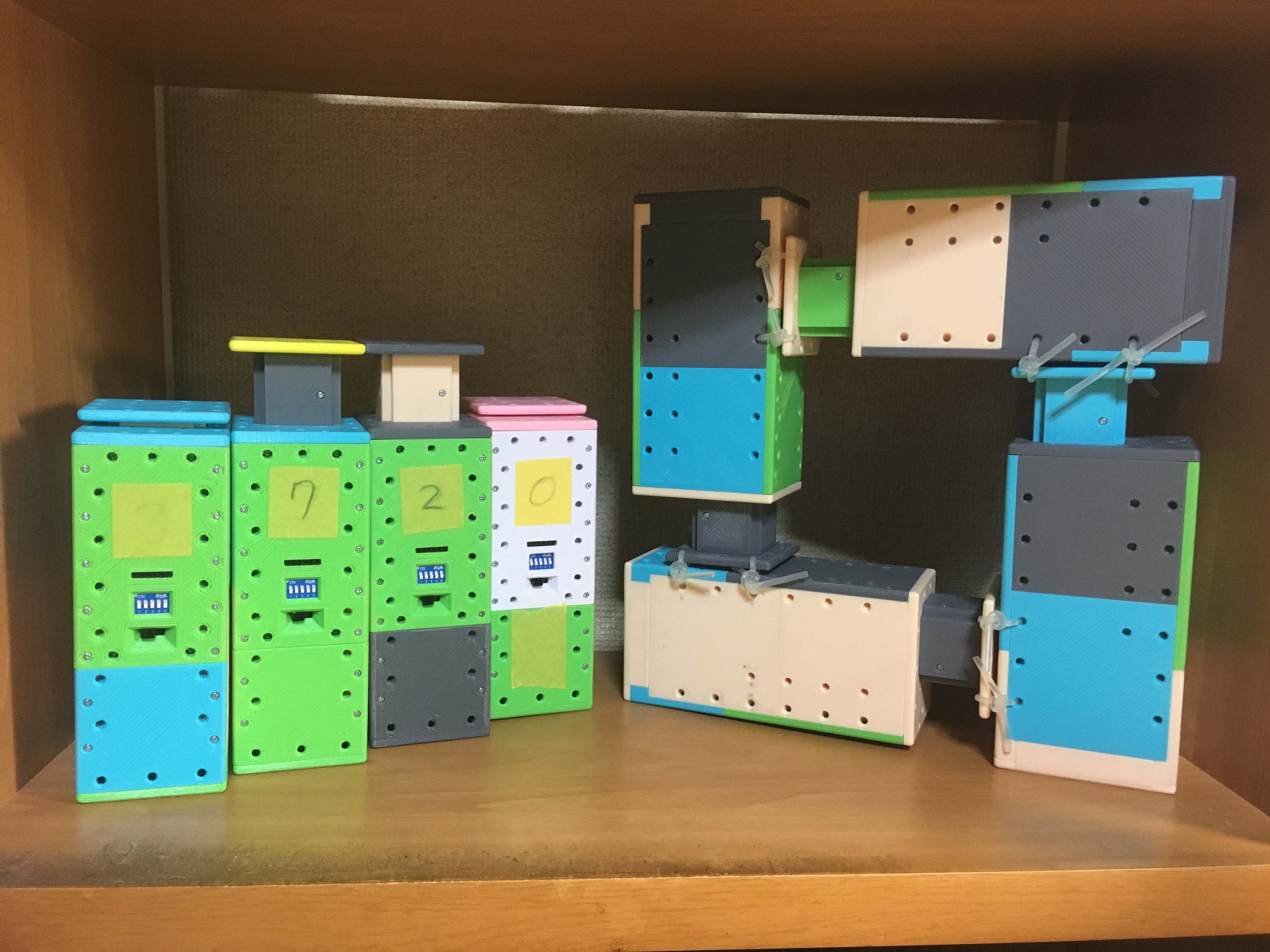 一つひとつ独立して動く。 結構パワーが強い(7キロ程度?) 同一のモノが現時点で8つある。 一つで全てを持ち上げるだけの力が出る。 互いを紐などで結ぶ。 紐が通れば何でもくっつけられる。 あと何かあるかな?