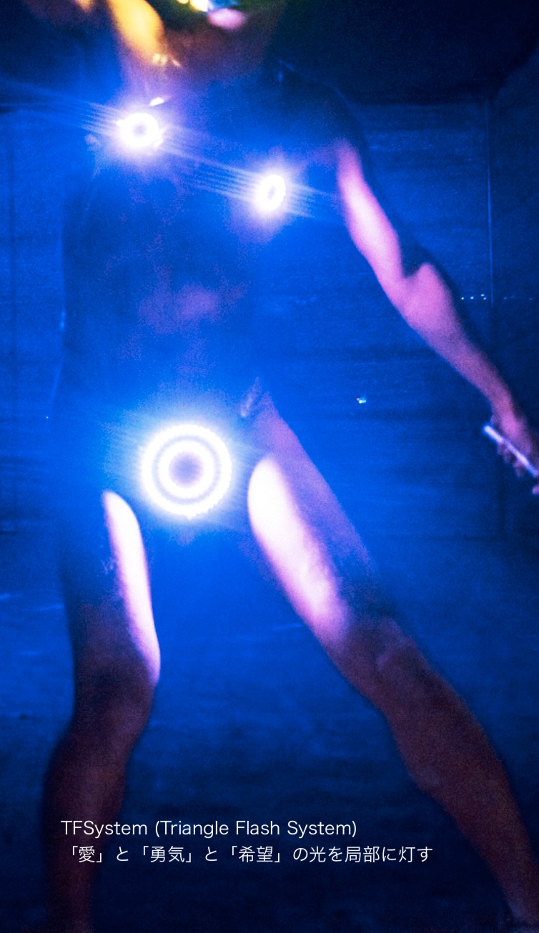 世界 70 億の潜在的ネオナチュリスト達に送る、局部を隠すことなく公然と人前に出られる新時代のウェア。 局部の周囲に装着する「閃光リング」により見る者の目を眩ませ、局部を露出していながら局部が見えないというブレイクスルーを実現した。