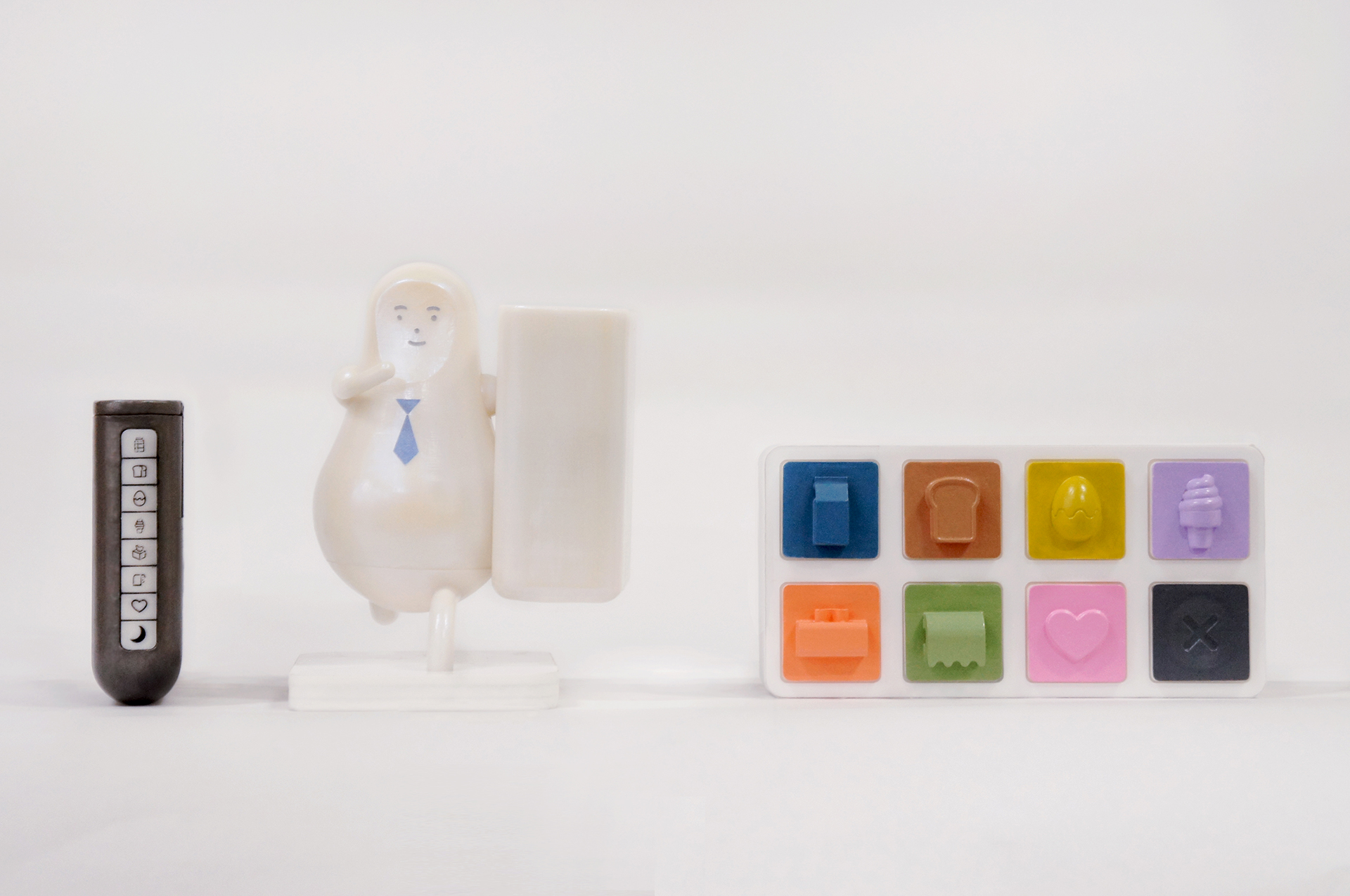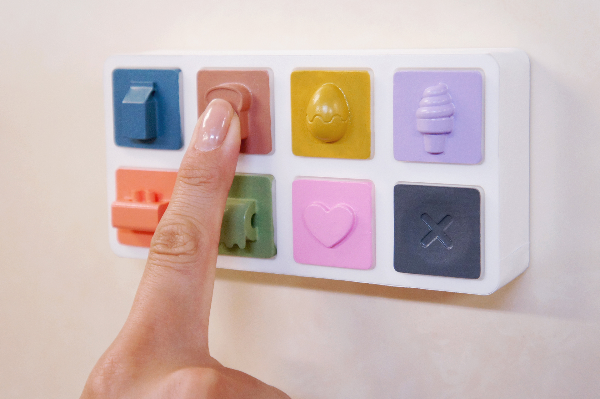 奥様が冷蔵庫に貼り付けて使用します。旦那様へのお使いランキング上位6位までの注文ボタン(牛乳、食パン、卵、スイーツ、ティッシュなど)と、今夜OKという意味であるYESサインボタン、注文キャンセルボタンの8つが用意されており、ボタンを押すだけで、旦那様への注文などができます。