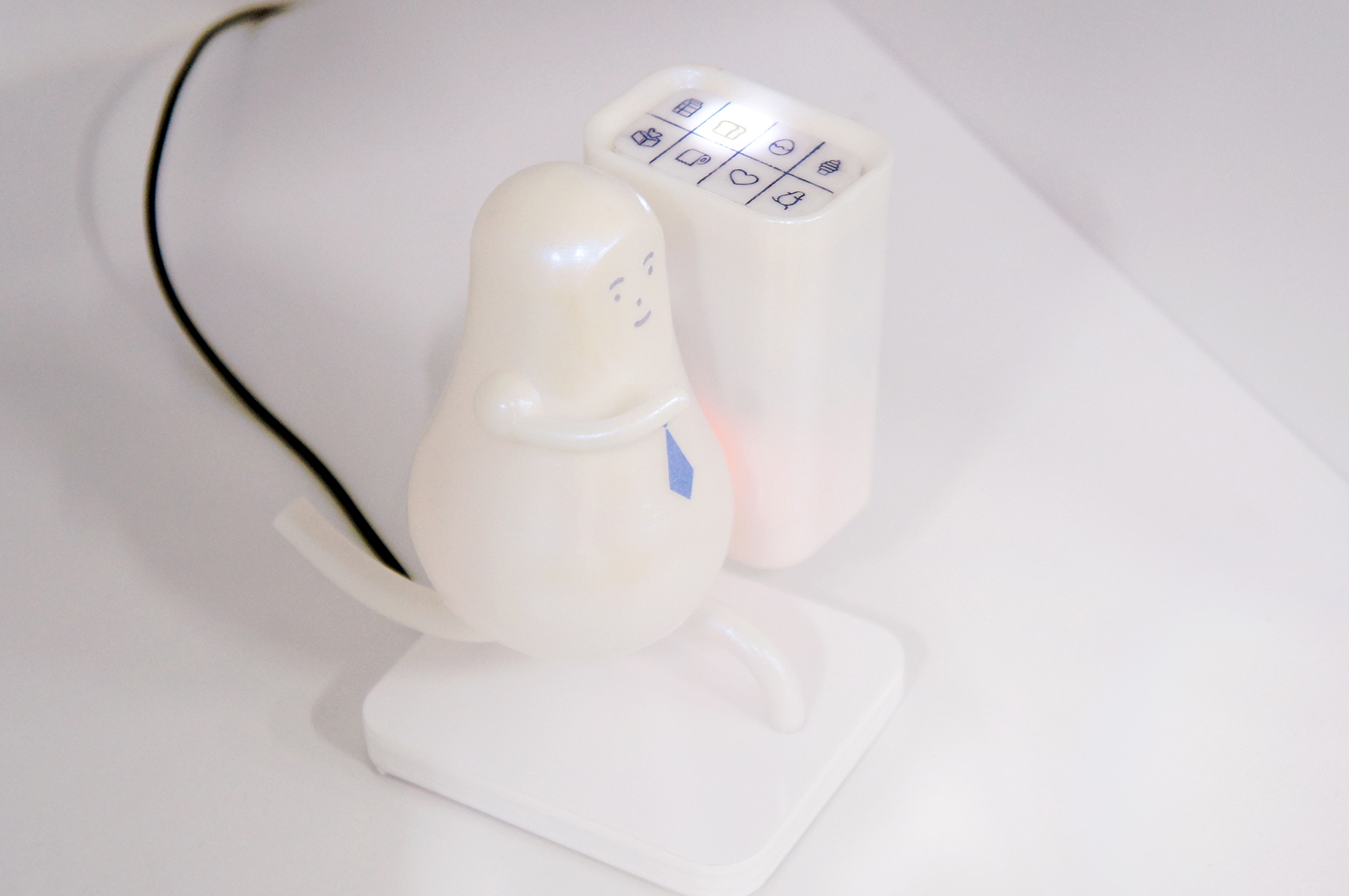 窓際などの外に電波を送信しやすい位置に設置し、ダンナダッシュボタンからの注文を受け取ると、長距離通信が可能なSubGHzを使ってダッシュキーホルダーへ注文情報を送信します。注文内容の確認ができる他、環境センサーによってリビングの状況をセンシングし、妻の就寝状況も送信可能です。また、中継ユニットの顔はシールになっており、旦那様の特長にあわせた外見に変更可能です。