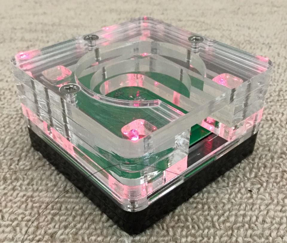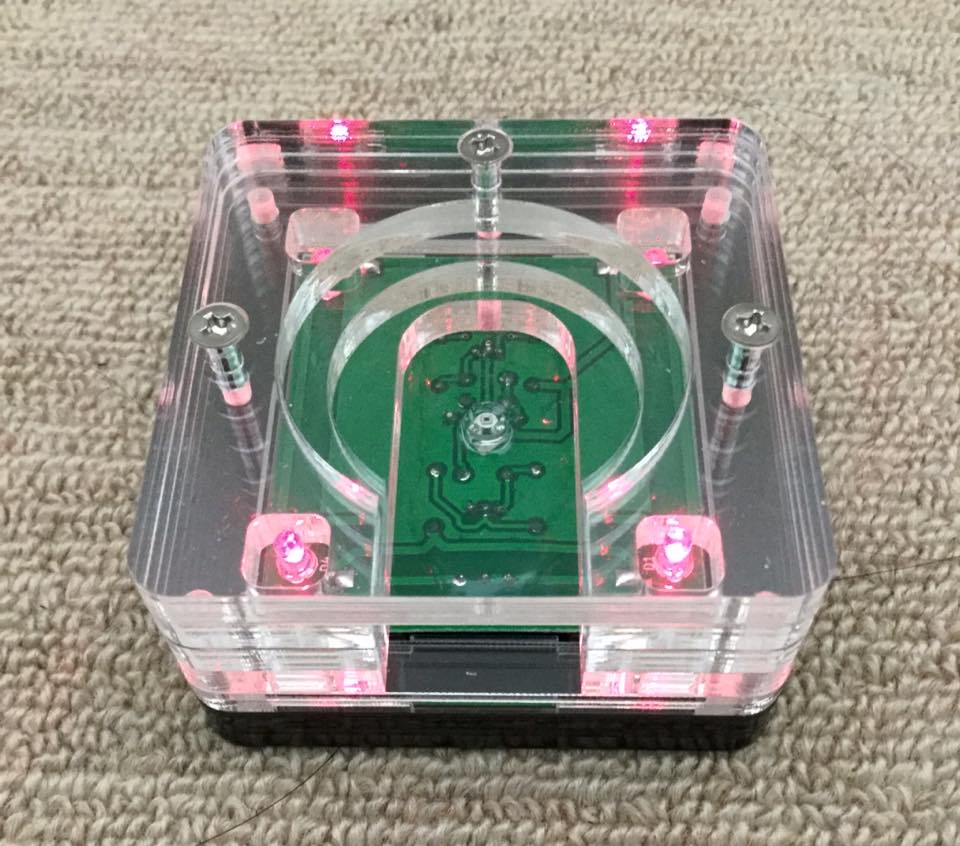 ハードウェア的にはアナログ回路のみ(フォトセンサとトランジスタ2本など)でデジタル回路(マイコンなど)はいっさい使っていません。(単4電池2本で動作) 不思議感を出すためにクリアアクリルの積層でケースを作りました。