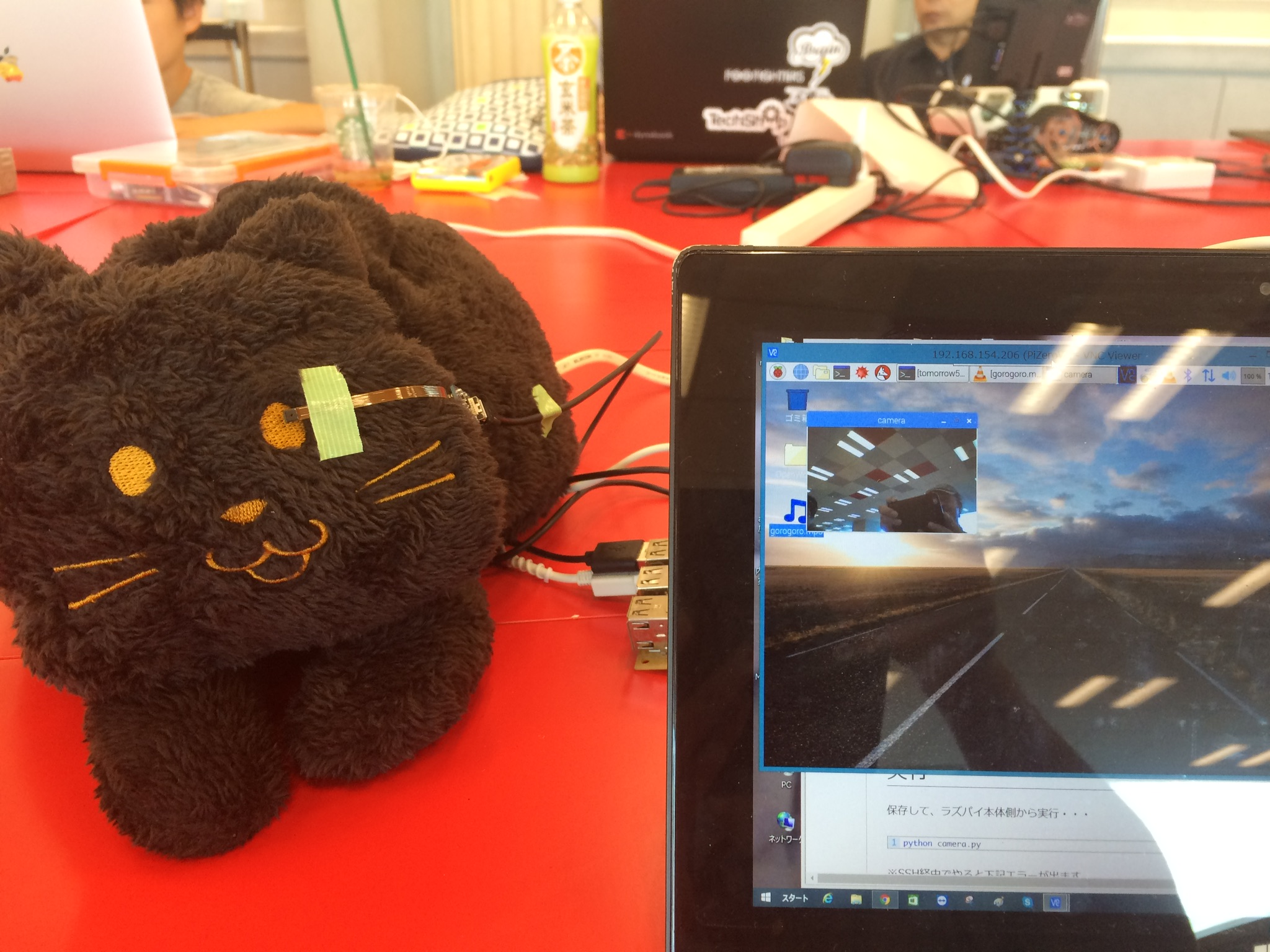 ゴロゴロ音については、Raspberry Pi Zero WでWeb上でゴロゴロ音をカスタマイズできるサイト(https://purrli.com/)にアクセスし、これをUSB Audioアダプタ経由で上記で作成したパクタイルに入力して振動に変えています。また、目の位置に設置したカメラの画像もInternet経由で見る事が出来ます。