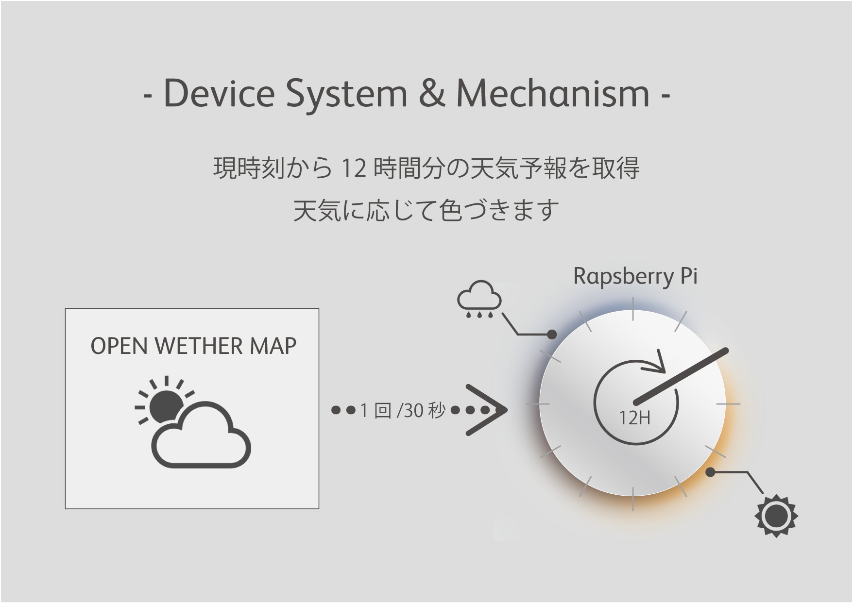 晴れは黄色、曇りは白色、雨は青色となり、現在時刻は、影の針で示します。 ※OPEN WEATHER MAP