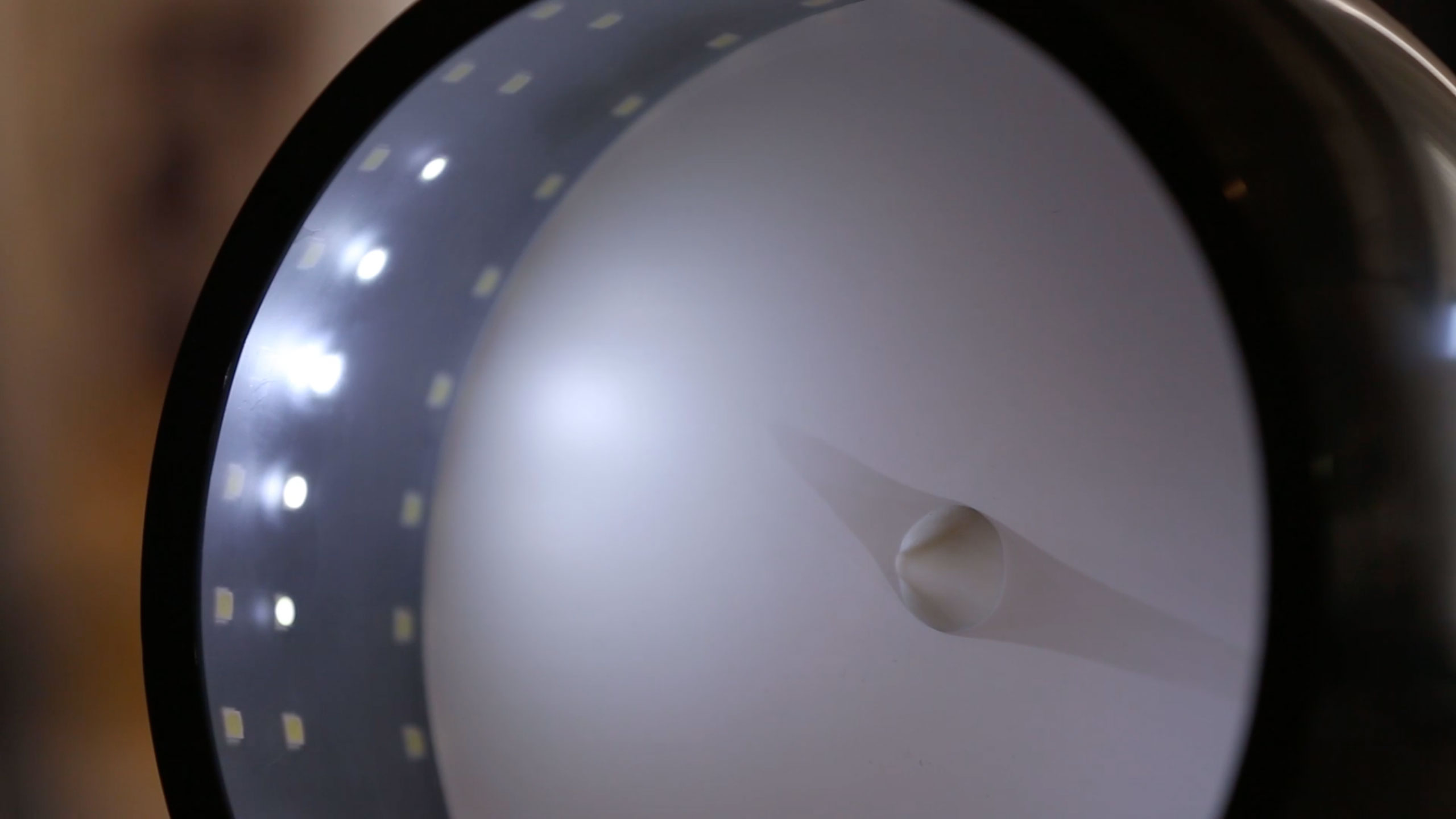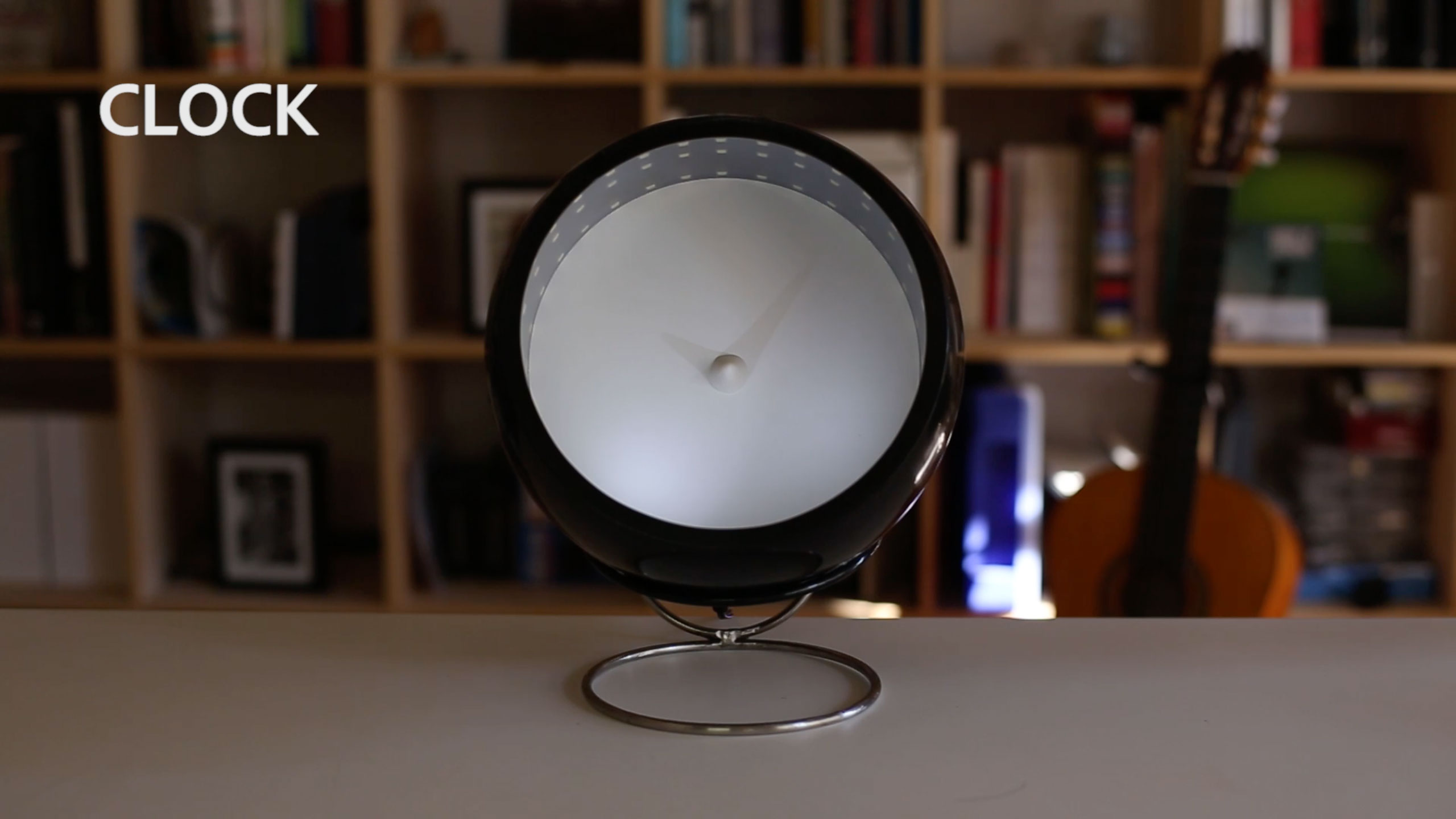 本機の側面から内側に向けて取り付けたLEDが、本機の中央に影を生み出し、時計の時針と分針を表示します。影を出すためのオブジェクトは、マグネットで取外しが可能なので、ユーザの好みに合わせて変更可能です。球体状の筐体は、設置角度を容易に変更できます。