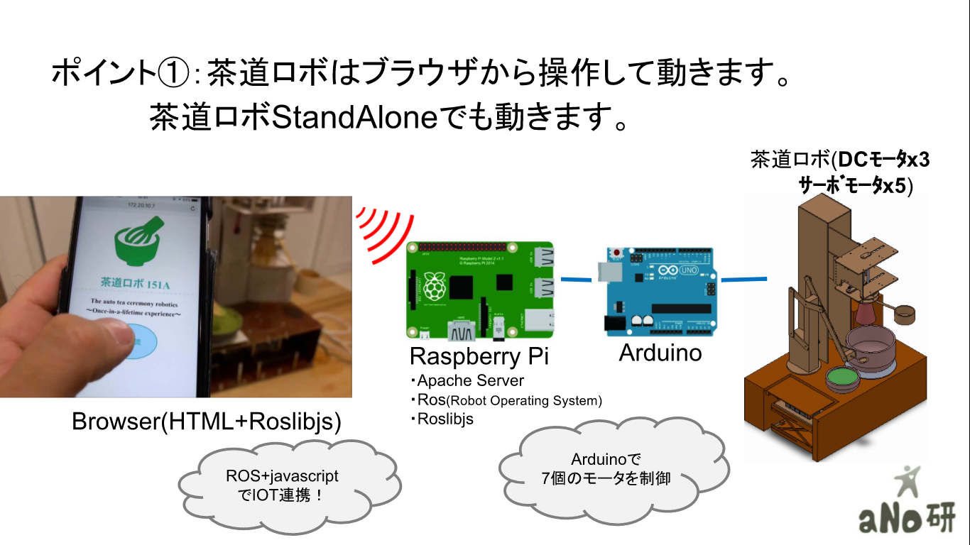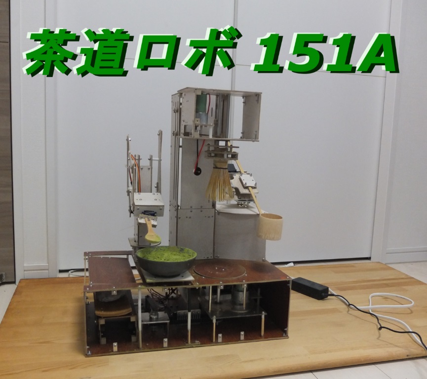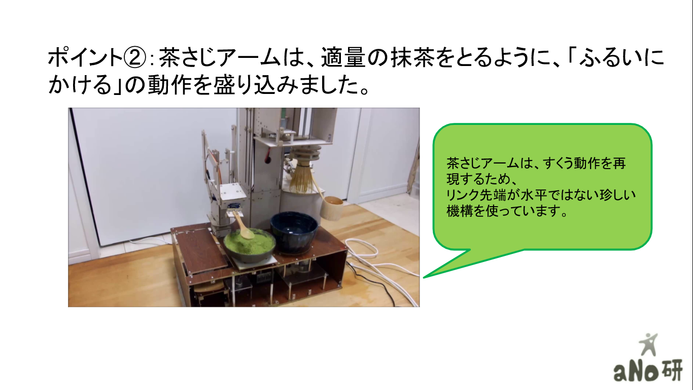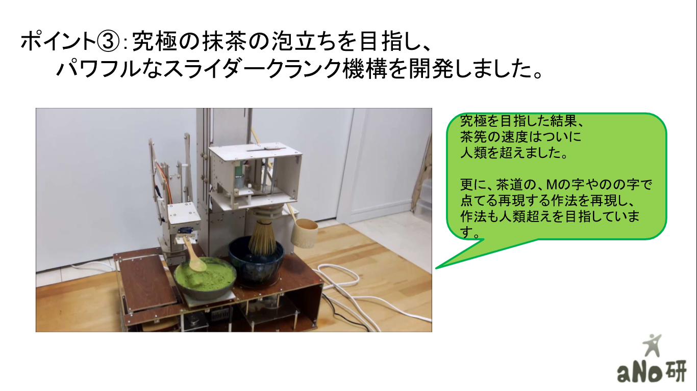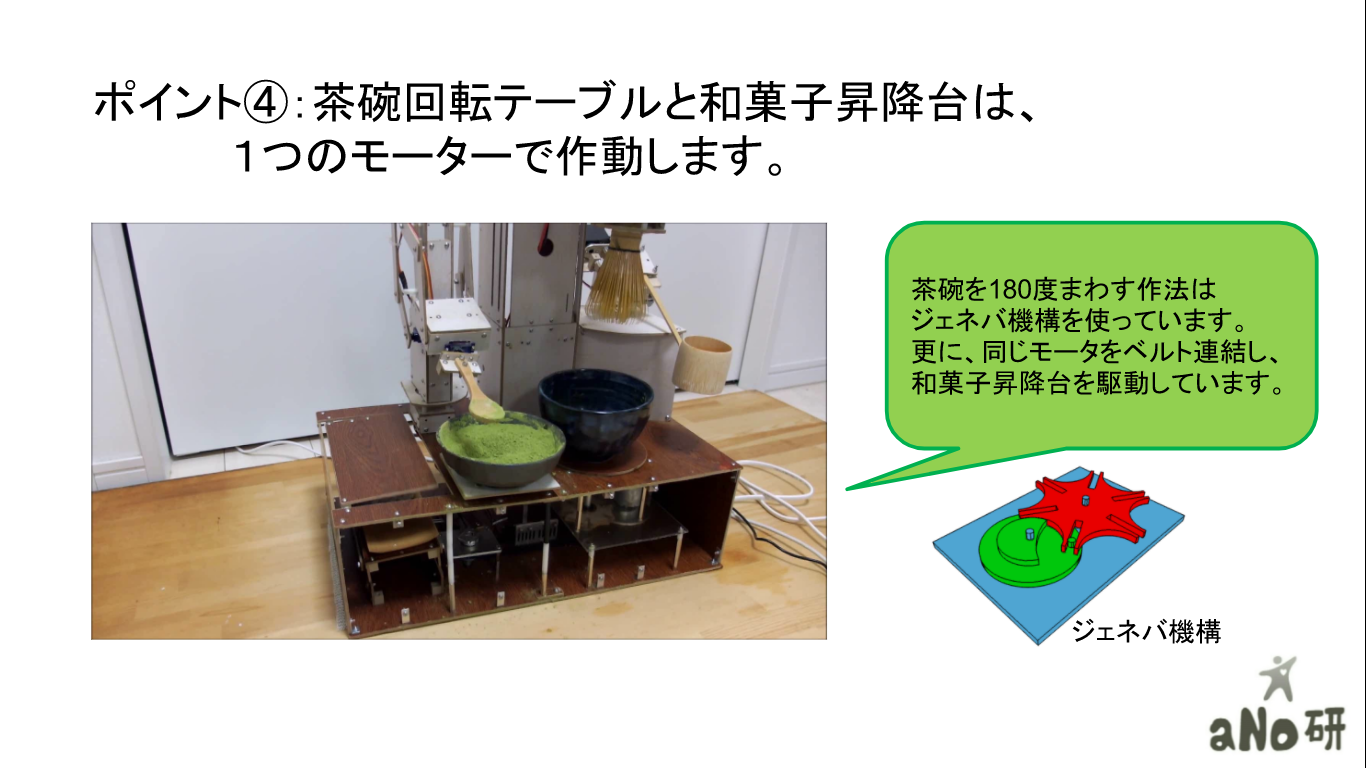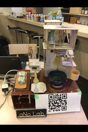 スマートフォンのプラウザから、RasberyPI・Arduinoと接続し、茶道の流派を選択すると、パワフルなスライダークランク機構を駆動してお茶を点てたて、お客様においしいお茶を提供します。また、茶さじ・柄杓・ターンテーブルが、お茶を点てる動作に連動して、動き出します。最後には、和菓子が昇降台から登場します。