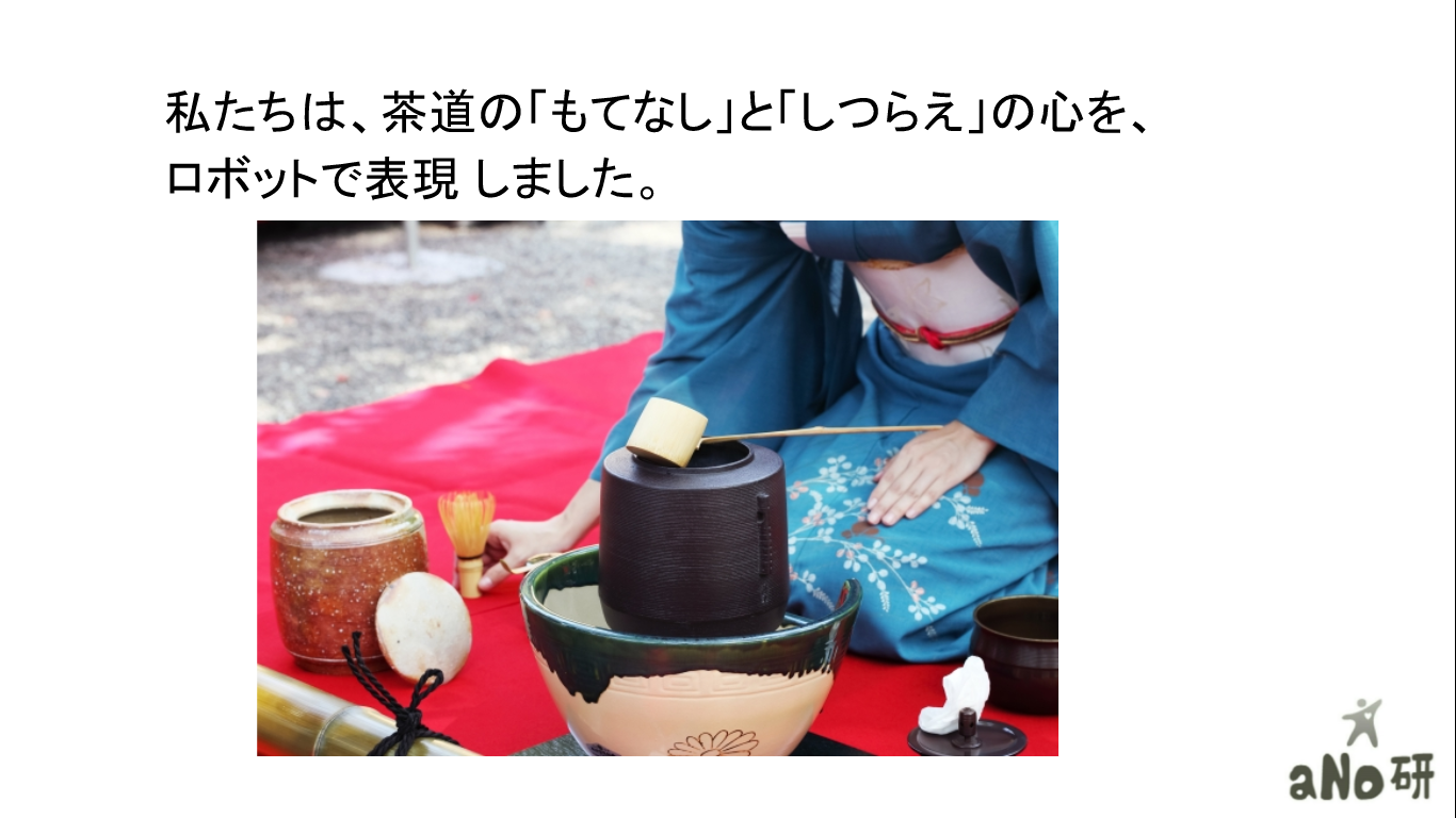日本の伝統文化、茶道。 私たちは、茶道の「もてなし」と「しつらえ」の心を、ロボットで表現 します。