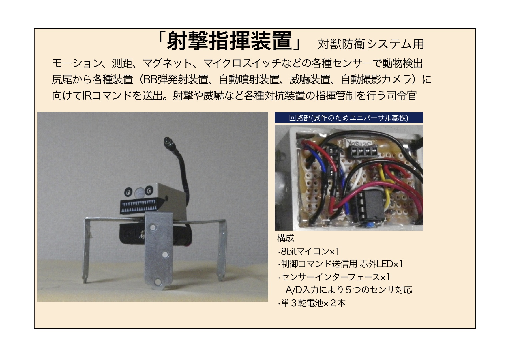 センサー型指令装置「射撃指揮装置」にて、侵入動物に対して複雑な威嚇アプローチを行い、定住する害獣を追い払う防衛システム。