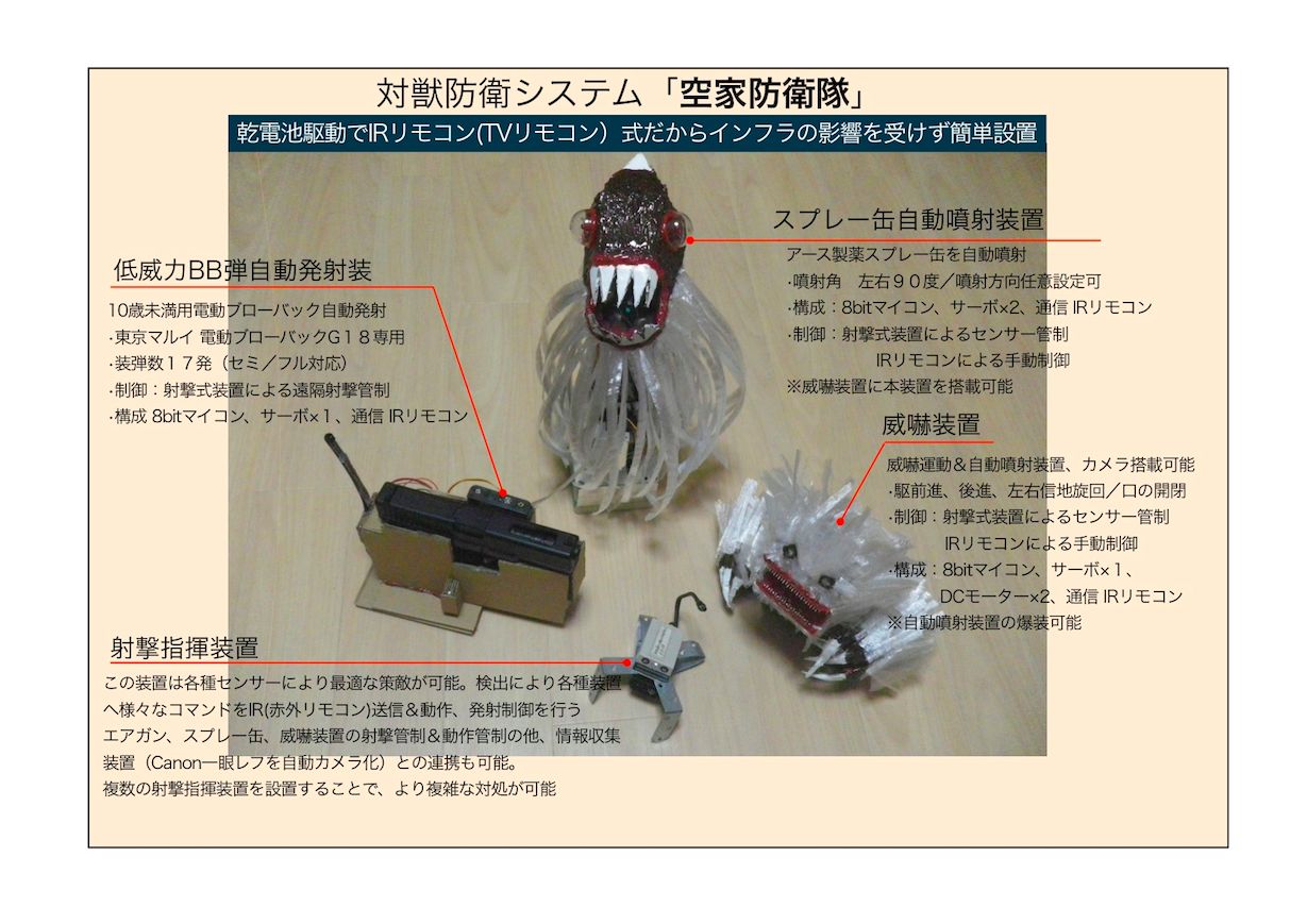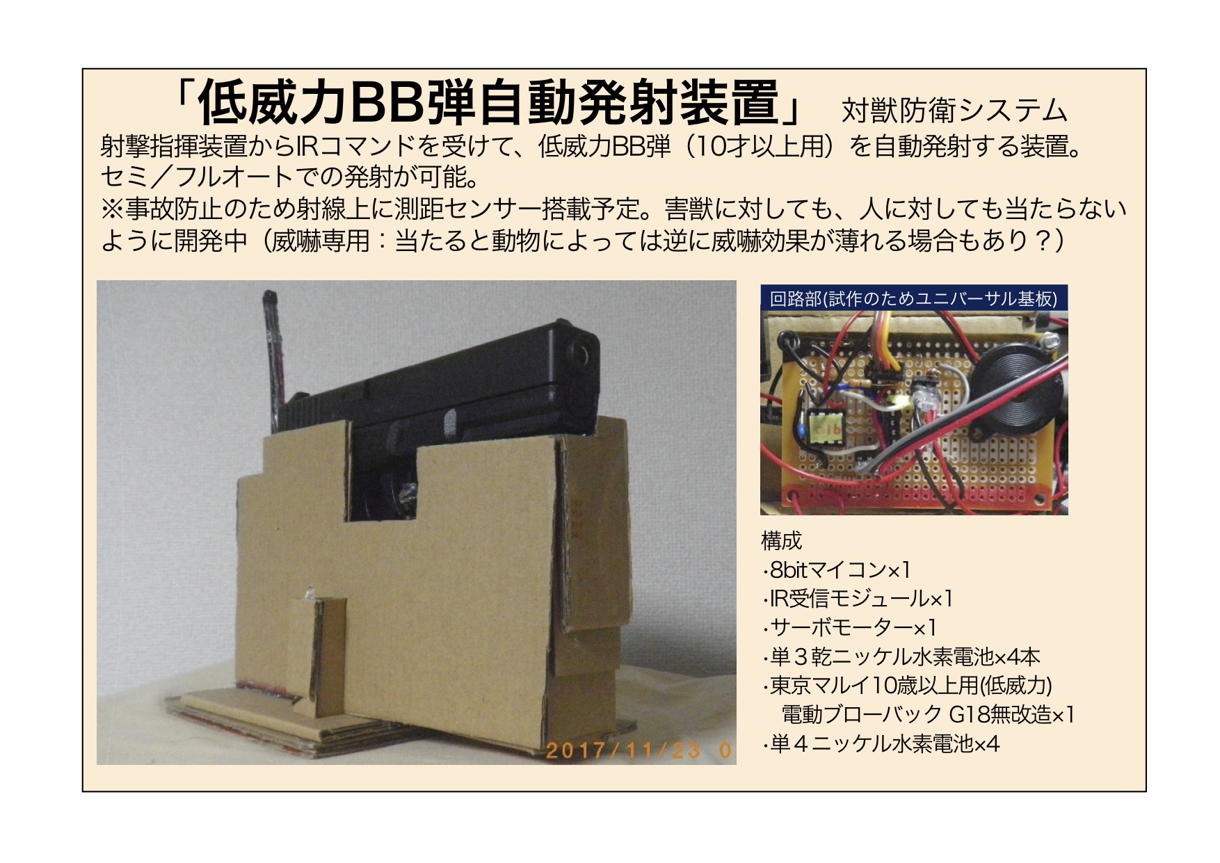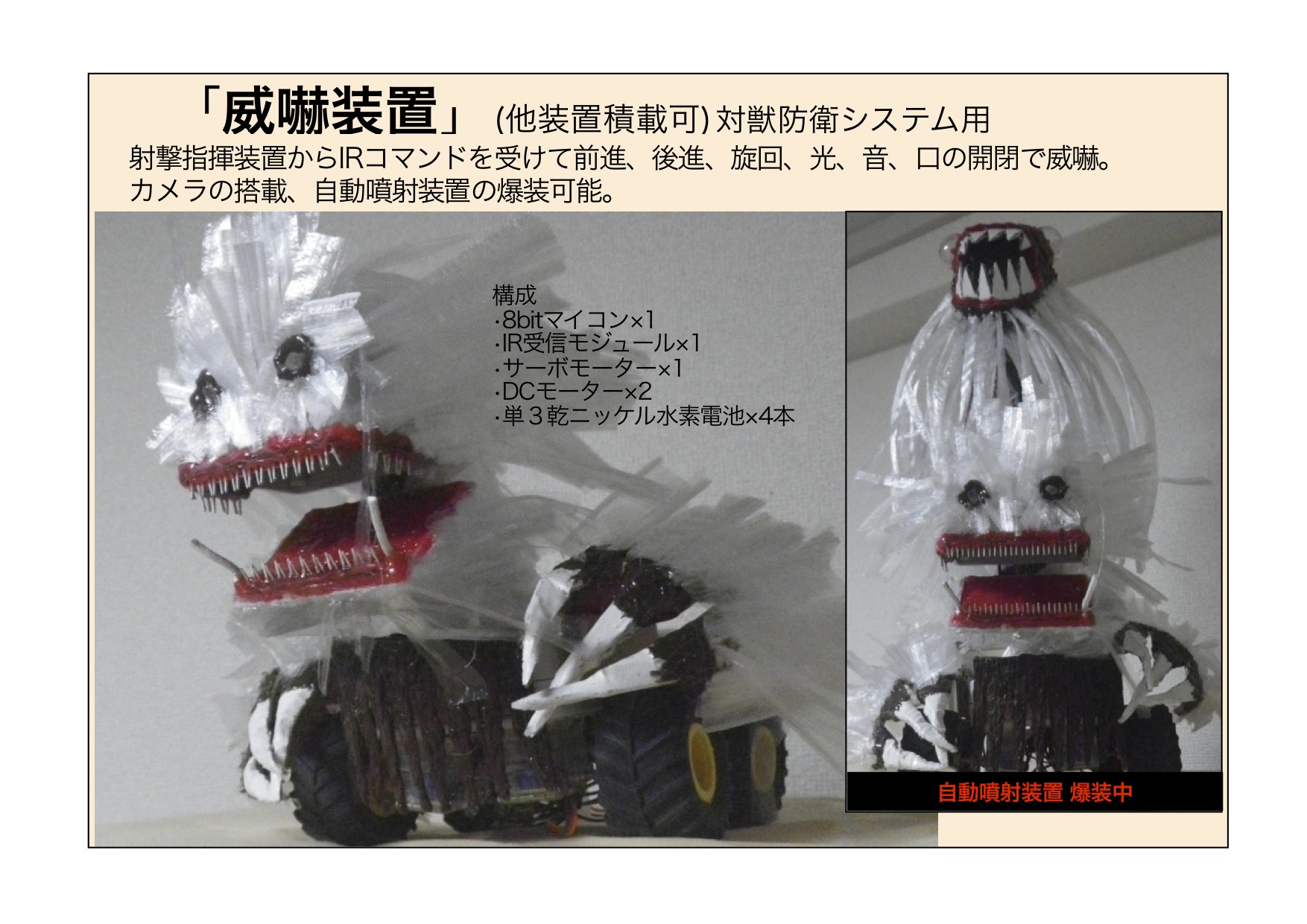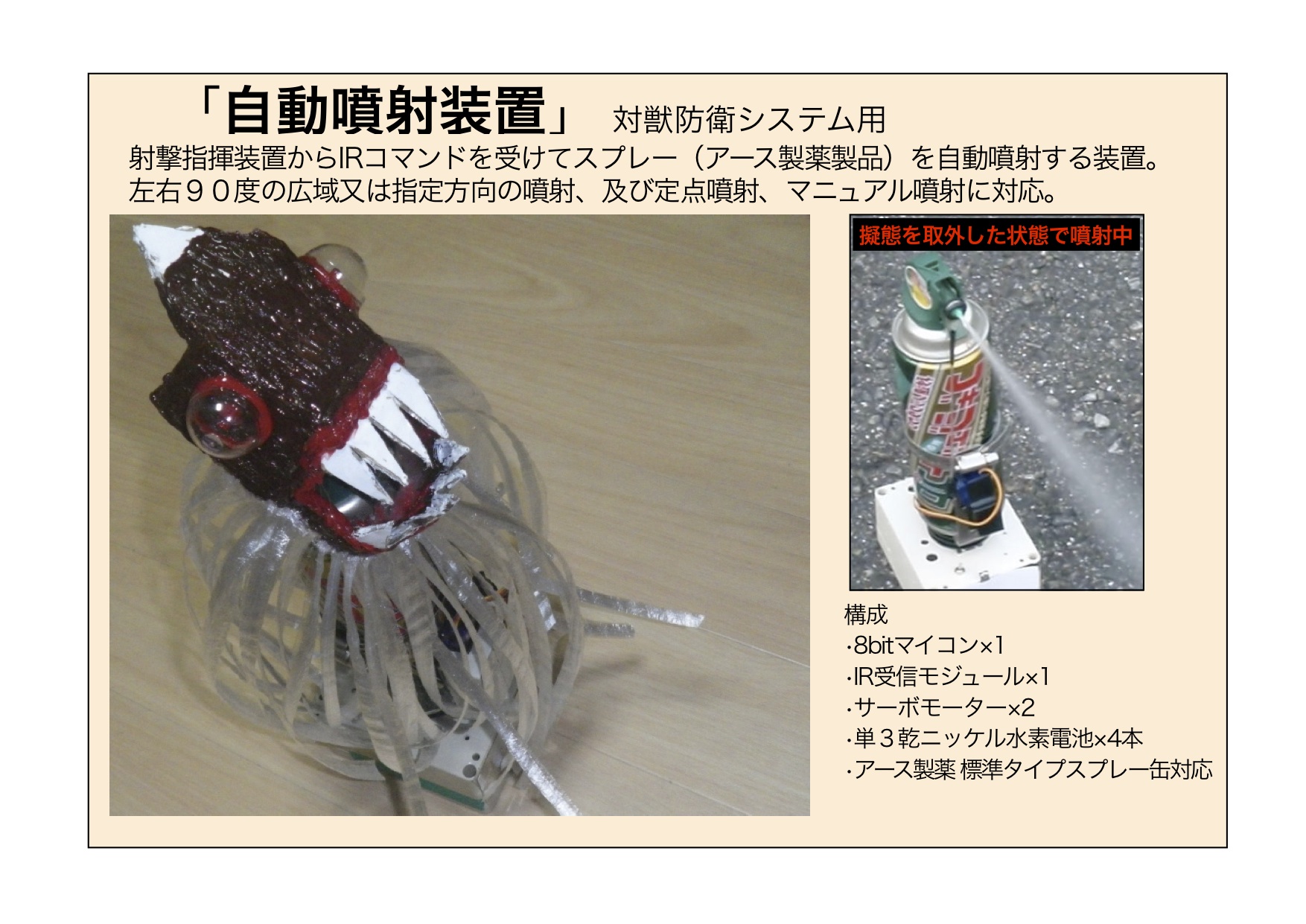(1)射撃指揮装置:センサー検知でBB弾発射装置、スプレー缶自動噴射装置、威嚇装置、カメラへ指令コマンド送信