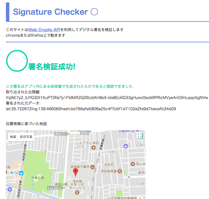 プレイ中の現在地の情報とbitcoinの最新ハッシュ値を暗号化して生成した署名をつけて