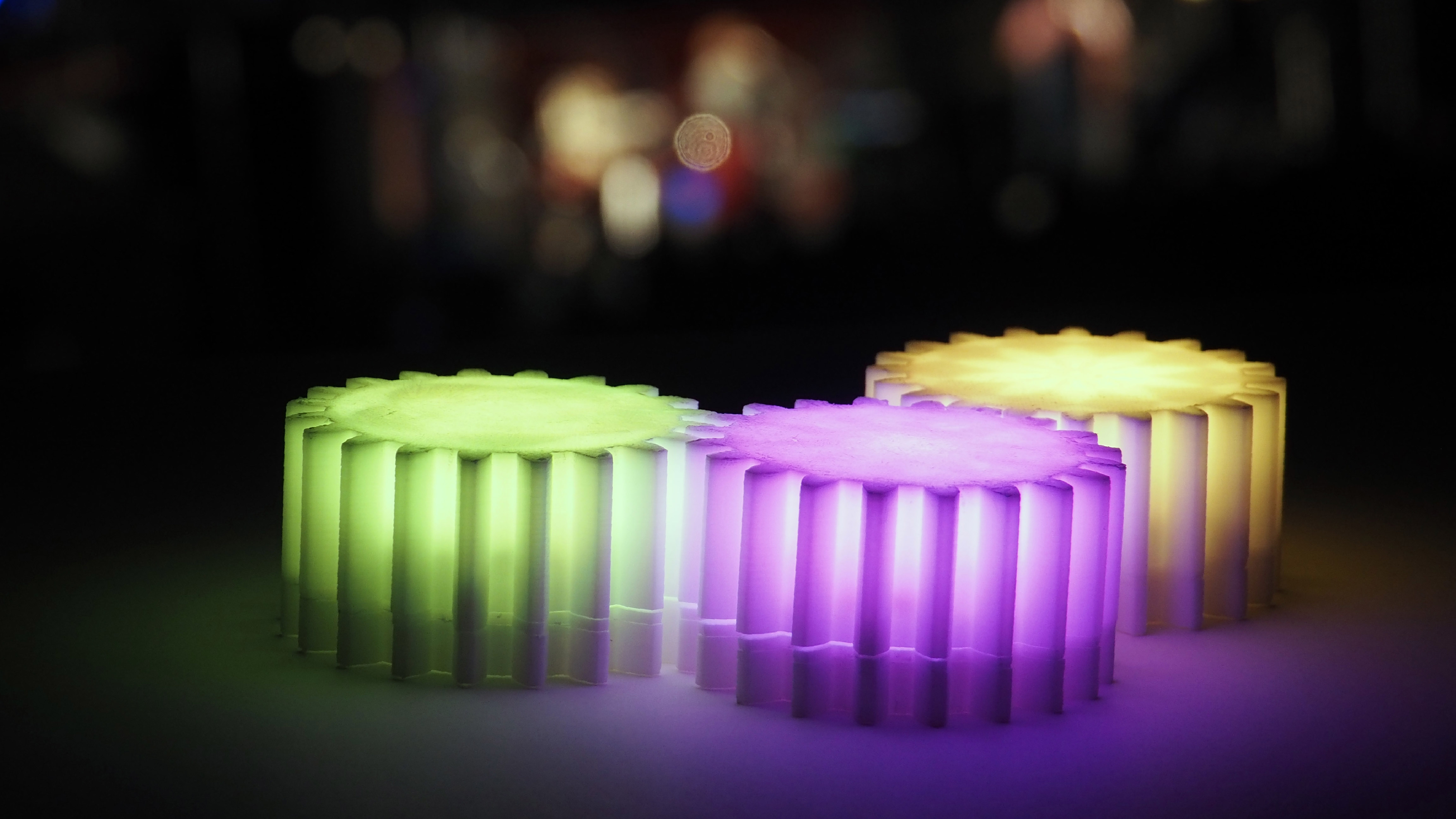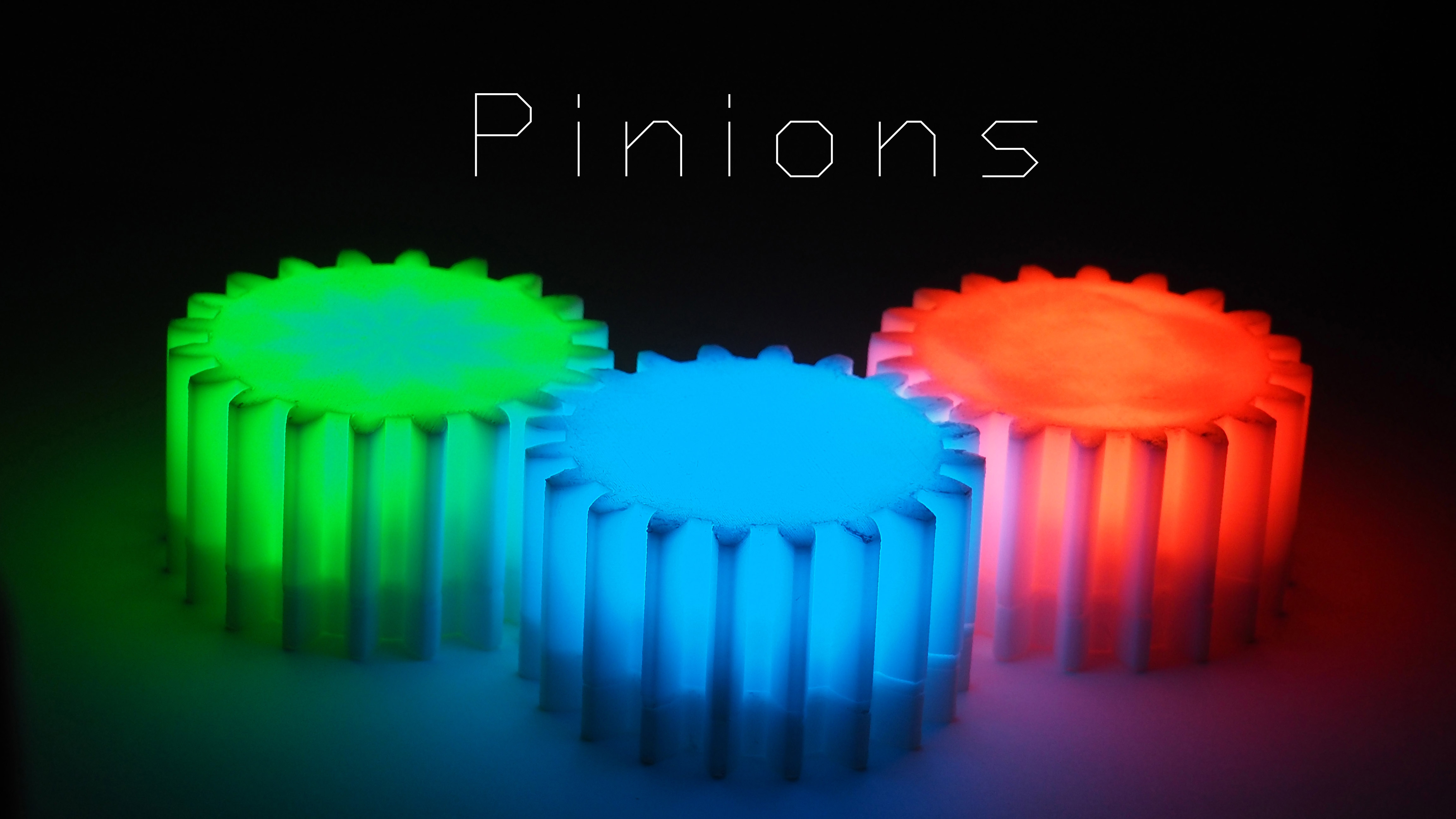 縁の下の力持ちである「歯車」にスポットを当てた。繋がり、力が伝わって、回転する。そんな歯車の面白さを素直に伝えることを目指した。回っている歯車に次の歯車を噛み合わせると、回転とともに光が伝播していく。光る歯車をならべて楽しむインタラクティブアート。