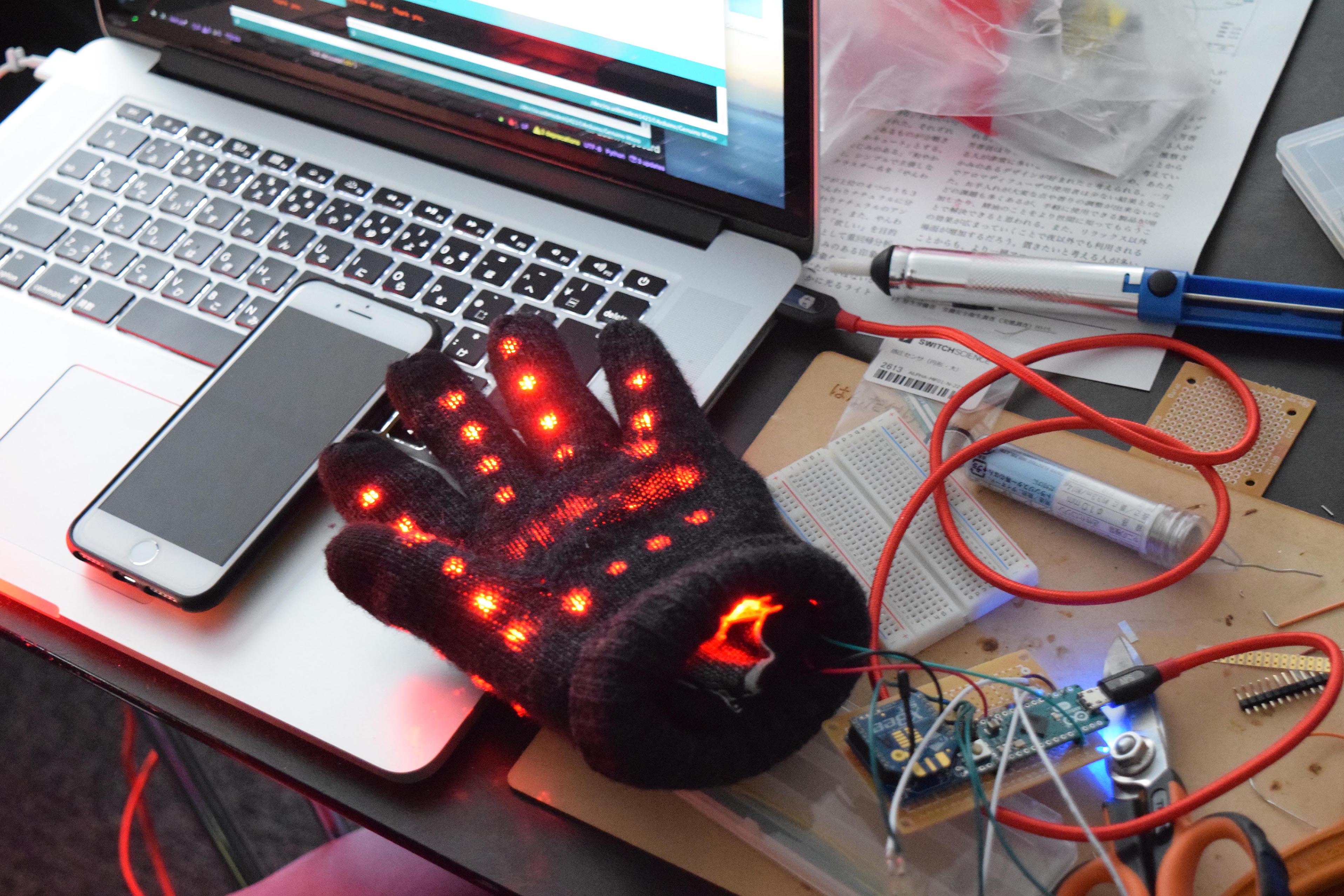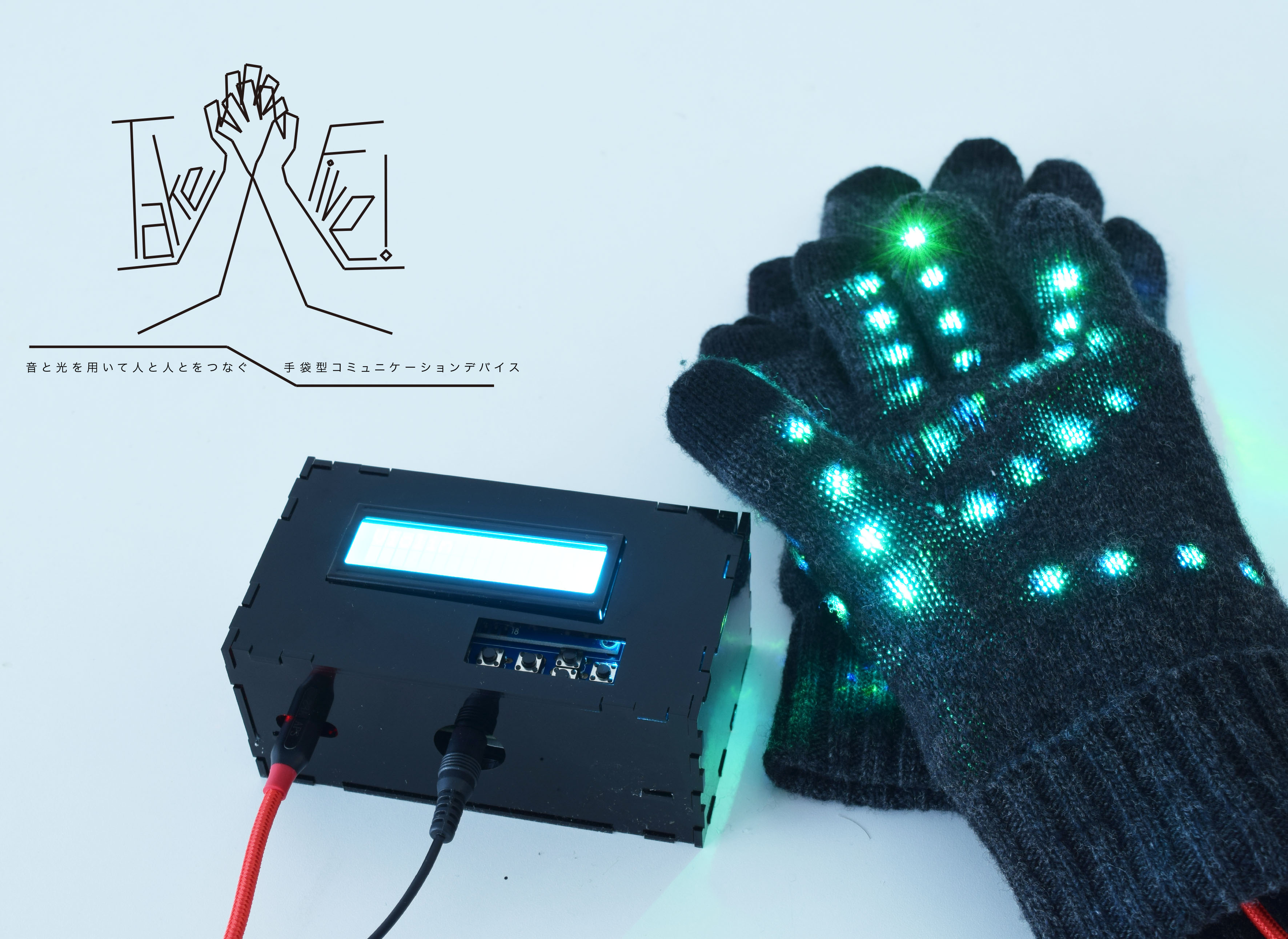 「ハイタッチをした時に音が鳴ったら面白そう」という小さなアイデアを具現化し、それによって生まれるコミュニケーションの活発化を目的とした手袋型コミュニケーションデバイス。音と光の二つの要素がたった5分遊ぶだけでも楽しませてくれる。「音と光による対人コミュニケーションの促進」をコンセプトに、30種類以上の音を鳴らせるハイタッチが人と人とをつなげるきっかけとなる。