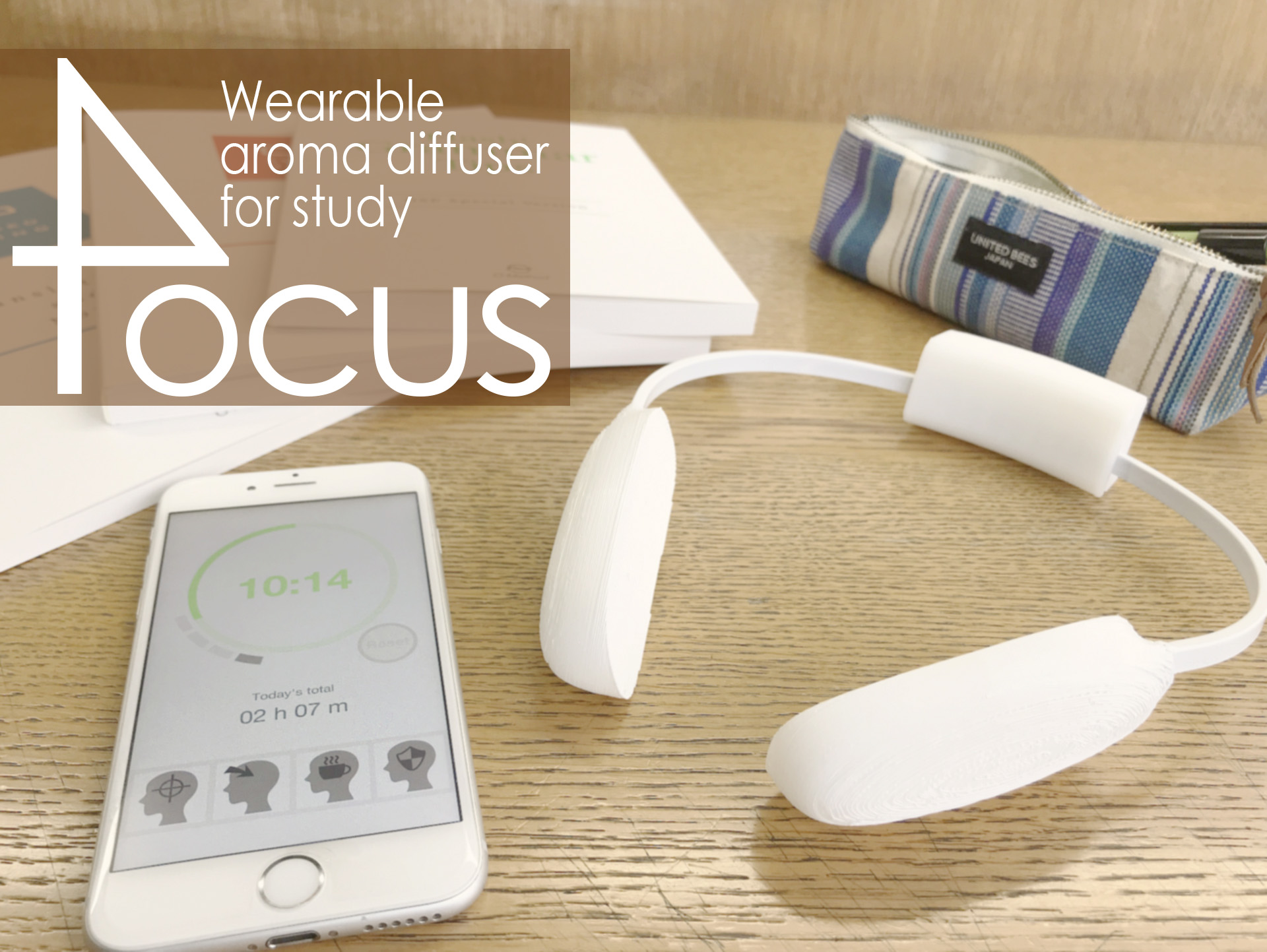 Focusはスマートフォンと連携し、勉強中に効果を発揮する4種の香りを自動発散することで勉強をサポートするウェアラブルアロマディフューザーです。