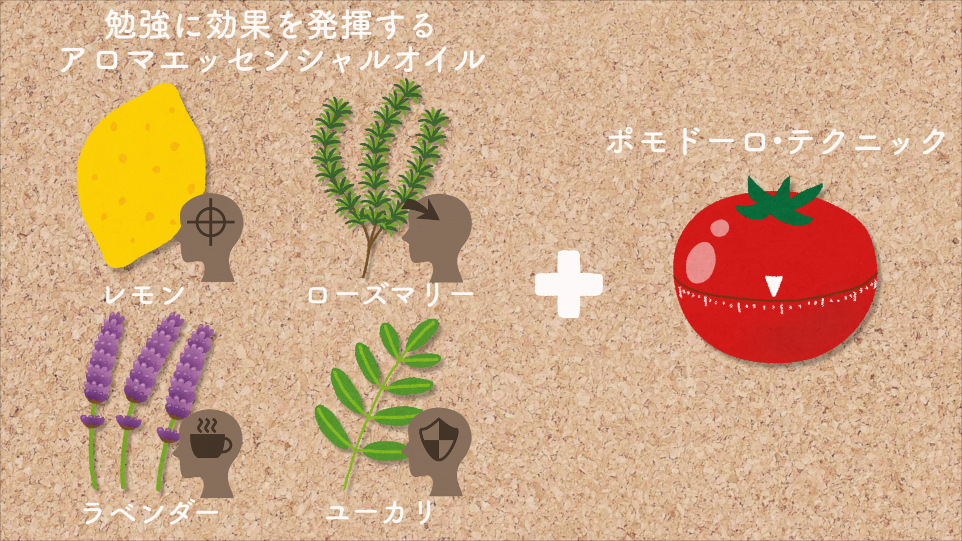 短時間で作業と休憩を繰り返すことで集中力を持続させるポモドーロテクニックをベースとし、25分間の作業タームにてレモンの香りによる集中力向上(10分間)とローズマリーの香りによる記憶力向上(15分間)を行い、5分間の休憩タームではラベンダーの香りによって気分を落ち着けます。また、ユーカリの香りをユーザーが任意に選択することで眠気、鼻づまり、ニオイといった集中を阻害する要素をブロックすることができます。