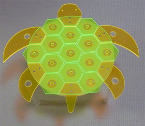 亀の形をしたアクリル製の楽器です。甲羅をたたくと、楽器の音が鳴ります。楽器の音色はピアノ、マリンバなど選択可能です。甲羅は13枚あるので、13種類の音からなる音階を演奏することができます。 ロボットに演奏させるために作られた楽器ですが、人間が演奏することもできます。
