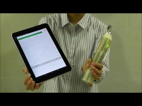 食べ物にスマートスプーンSAJIKAGENを触れさせます。食べ物が冷たすぎるときは青いLEDランプとブザー音で、熱すぎるときは赤いLEDランプとブザー音で警告してくれます。