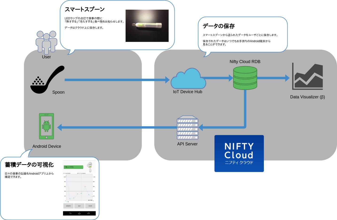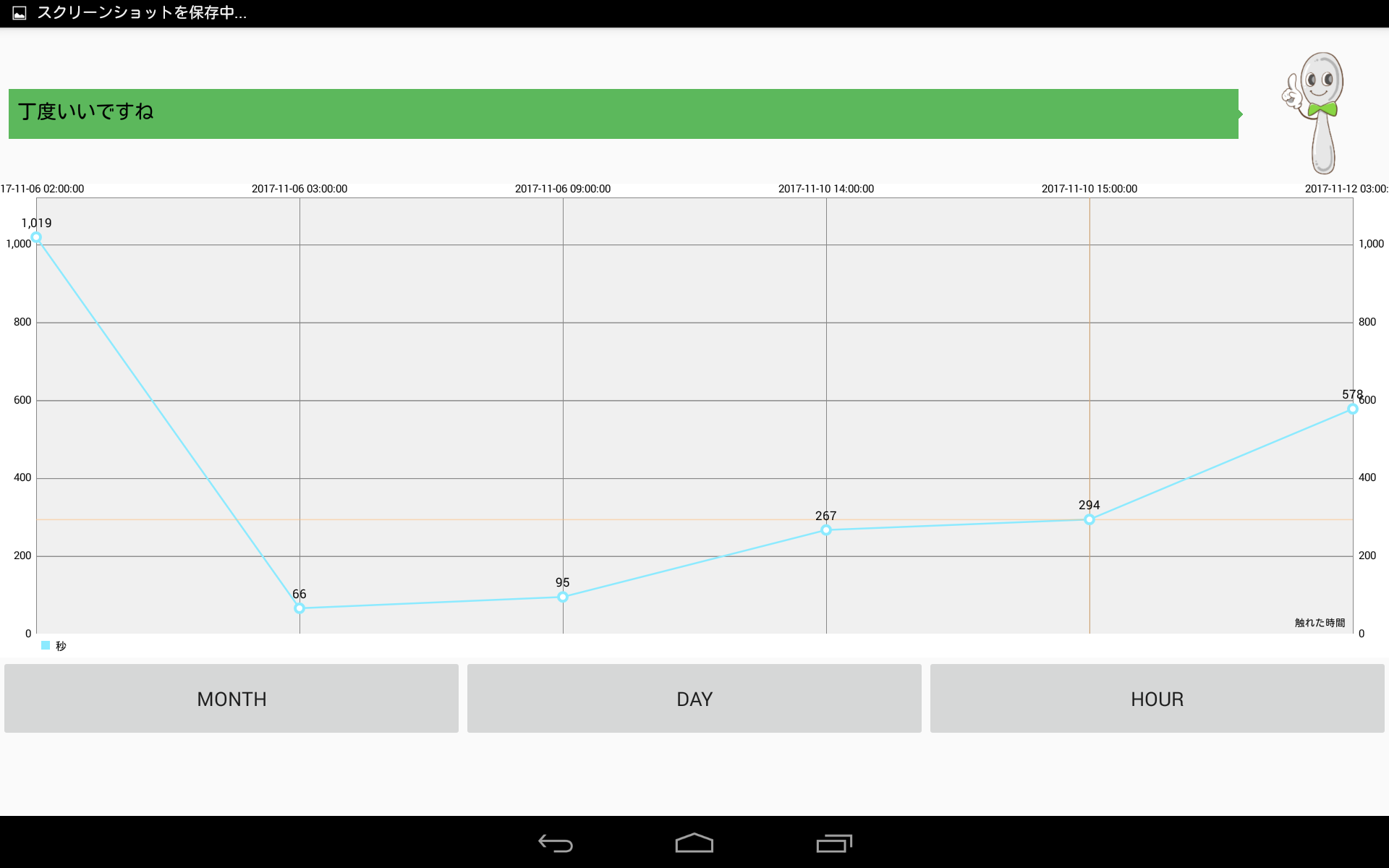 スプーンで計測された温度データはデータベースに蓄積され、Androidアプリから月・日・時間ごとの、適温から外れた回数を記録し、グラフで確認することができます。また、アプリ右上部に表示されるキャラクター「スプーンくん」が食事温度の診断をしてくれるので、直感的に食事温度習慣を把握できます。