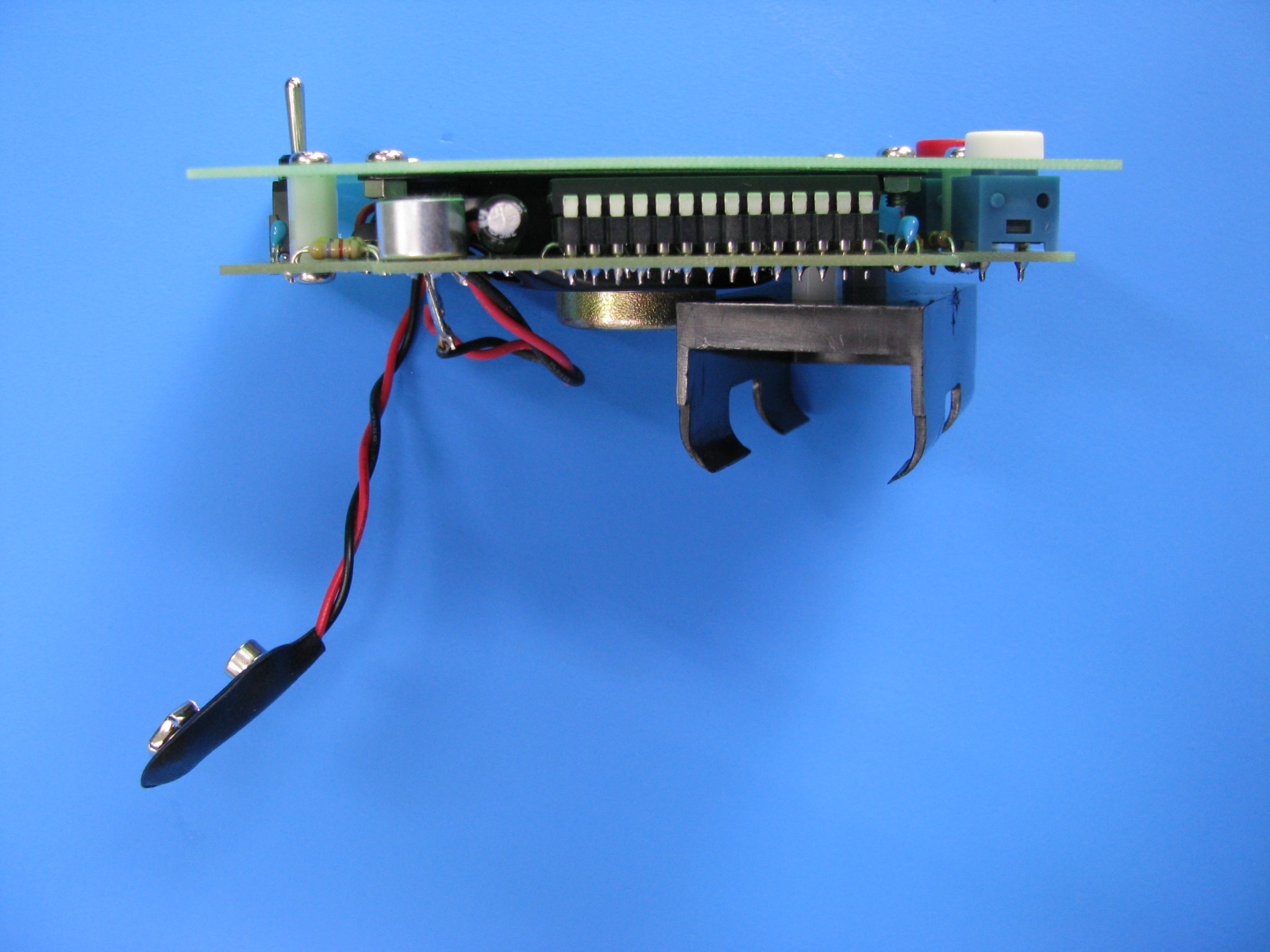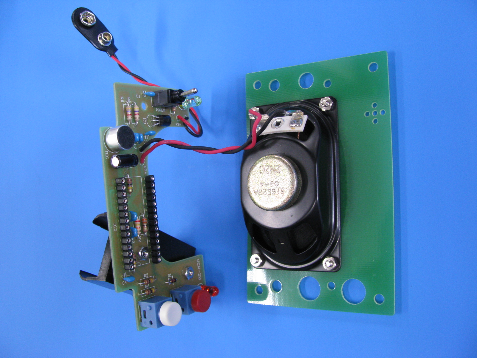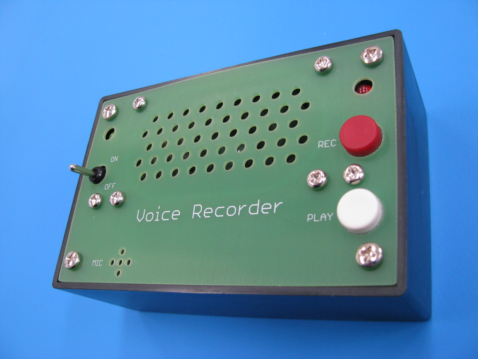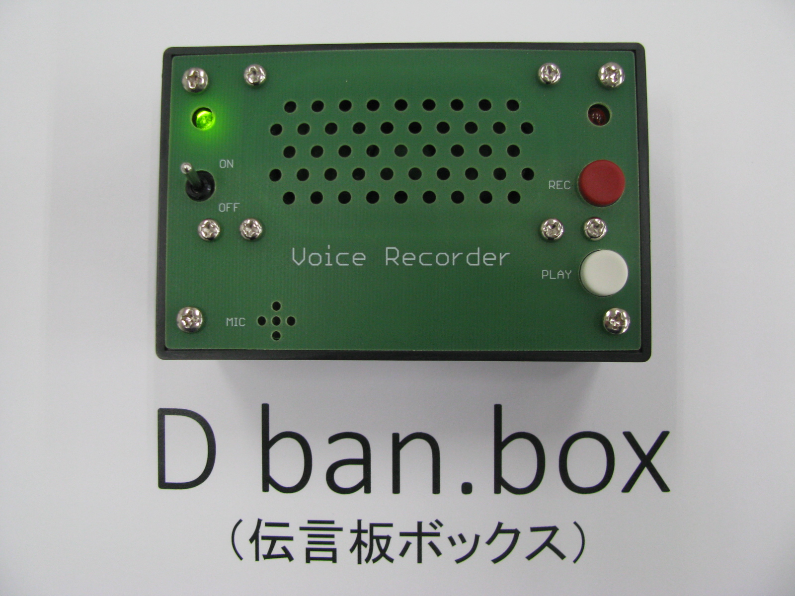 ボイスレコーダICを使用した伝言板ボックス。このICの機能を極力しぼり、赤いボタンで録音、白いボタンで再生できるとてもシンプルな操作性を実現。ケース内にはプリント基板が2枚と006P電池がすっぽり収まるコンパクトで、しかも安価なディスクリート部品を高密度に配置した設計。アルミ板のふたをプリント基板に置き換えて、スイッチ、マイク、LED、押しボタンスイッチの穴開けとシルク表示はプリント板CADによる設計。そのため、金属加工や印刷表示などは一切使用せずに、安価できれいな仕上がり。電池を挿入し、電源をONするだけで簡単に使用できます。