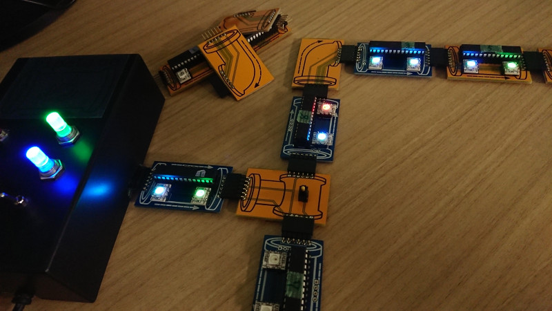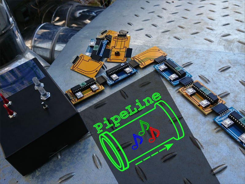 PipeLineは、音階とドラムのリズムを記憶した「パイプ」と称するブロックをつなげ合わせていくことで音楽を作り出す楽器です。それぞれのパイプには2つのLEDが搭載されており、楽譜上の音符のようなイメージで、パイプに割り当てられたメロディーとリズムが流れていきます。