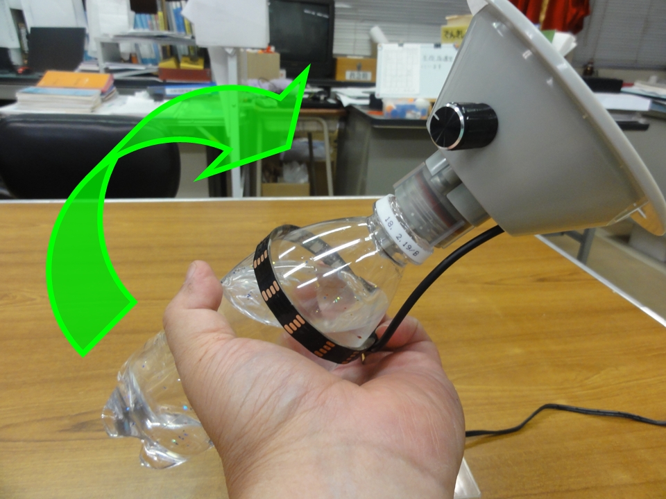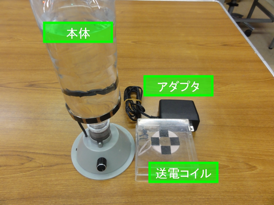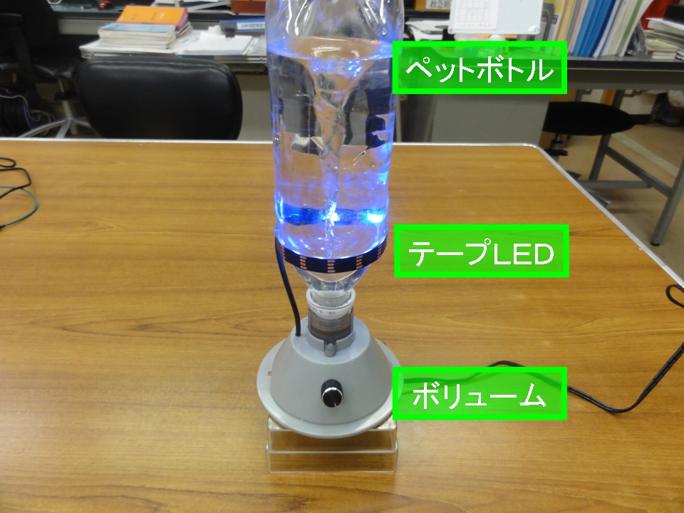 ●本作品は送電コイルから受信コイルに電力を送り,スクリューでペットボトルの水を撹拌してトルネードを発生させています.またテープLEDを装着することでペットボトル全体をライトアップさせました.さらにトルネードの高さを調整できるようにスクリューの回転数をPWM制御しています.