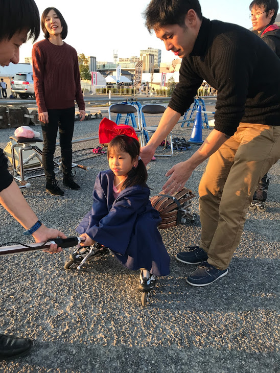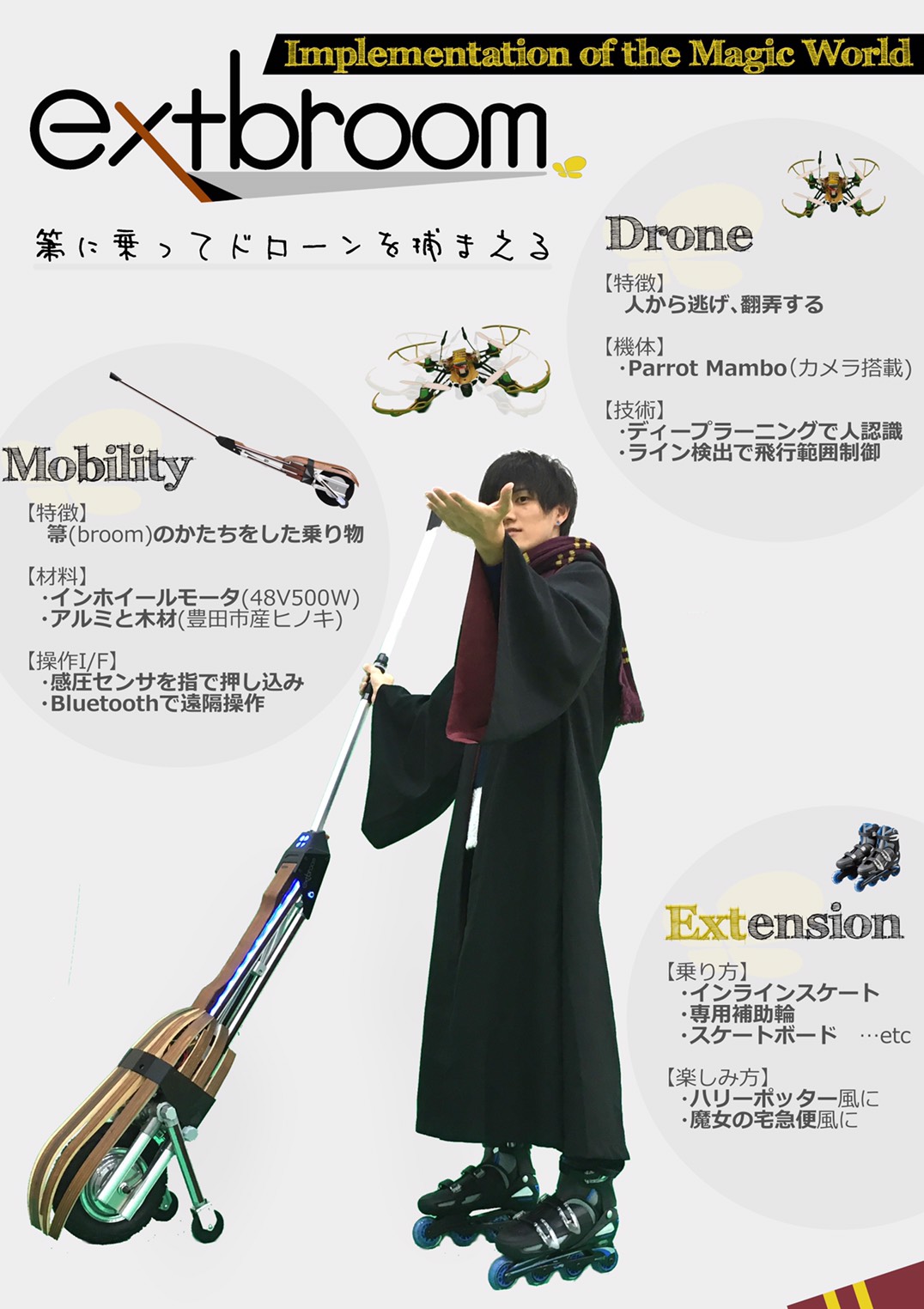 ext-broomはextension(拡張する) broom(ほうき)を意味しており、身体能力を拡張するほうき型モビリティと、自律型ドローンを組み合わせた、「クィディッチ」をプレイするためのシステムです。インラインスケート又は専用の補助輪を装着し、ほうきに跨れば自由自在に走り回ることが出来ます。
