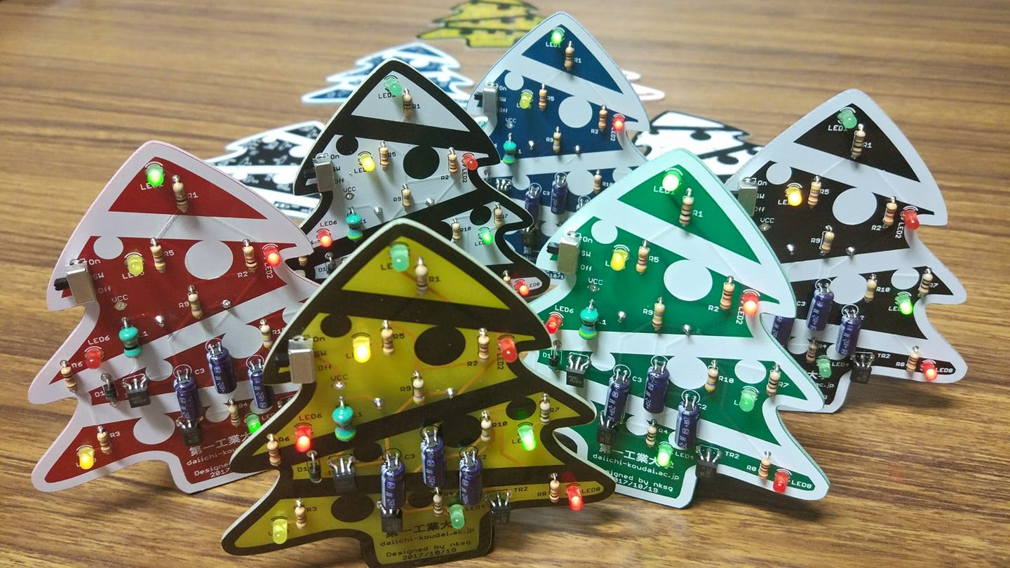 基板は6色、作ってみました。電子部品がオーナメントになった可愛らしいクリスマスツリーです。サイズは高さ10cmほど。基板の後ろには電池ボックスがあって、電池の重さで自立します。また、電池ボックスはフックにもなります。置いて飾ってもよし、胸のポケットに入れて着飾ってもよし。