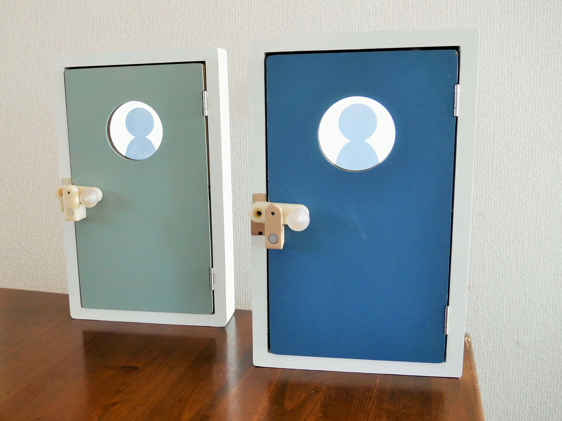 昨年度応募作品を再設計し、相手の状況を検出・表示するためのセンサとのぞき窓・およびデバイスの状態を示すLED(通話中・着信中など)を追加しました。これにより相手の存在により気付きやすくなるとともに、使いやすさが向上しています。